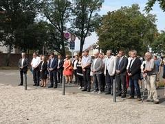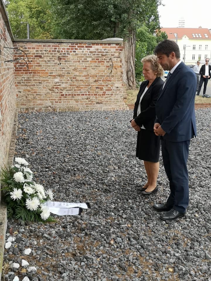 Anlässlich des 80. Jahrestages des „Euthanasie“-Erlasses von Adolf Hitler und des Überfalls der deutschen Armee auf Polen haben heute (Sonntag, dem 1. September 2019) Oberbürgermeister Steffen Scheller und die Leiterin der Gedenkstätte Dr. Sylvia de Pasquale zusammen mit Vertretern der Stadtverordnetenversammlung und zahlreichen Bürgerinnen und Bürger Kränze am Mahnmal am Nicolaiplatz niedergelegt.