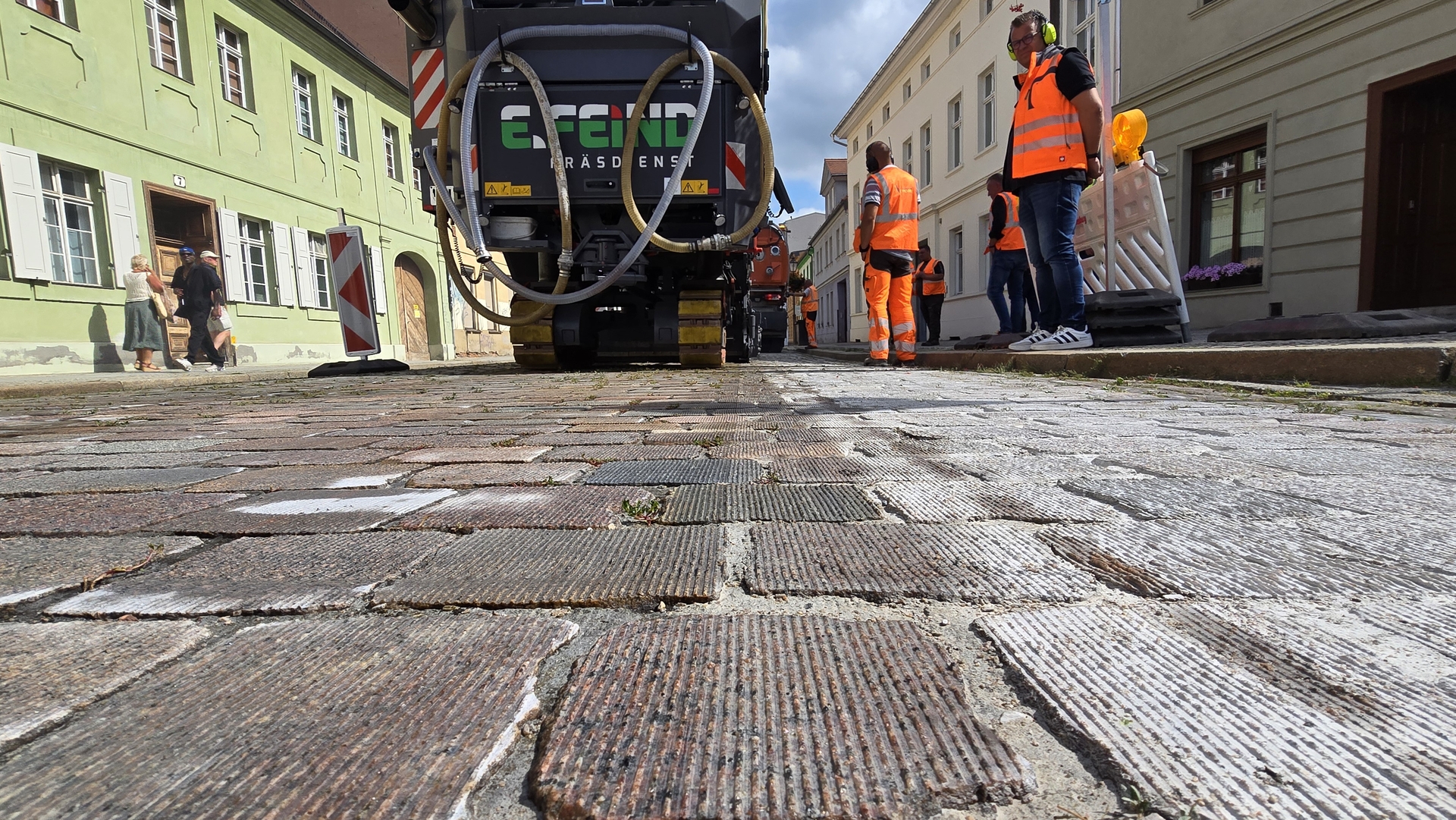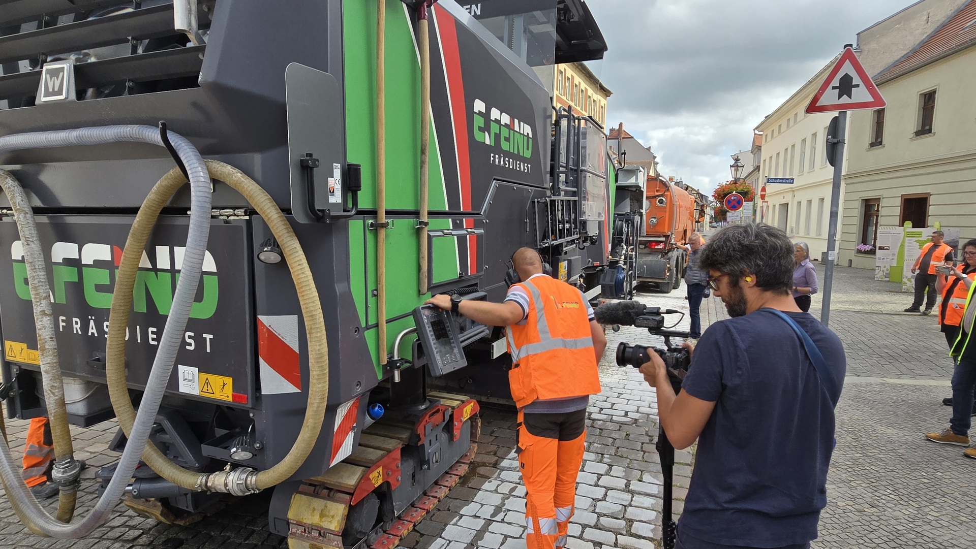 Am heutigen Mittwoch stand pünktlich um 09:00 Uhr die stattliche Maschinerie der Firma Fräsdienst-Service E. Feind GmbH aus Lübben an der Ausfahrt der Schusterstraße parat, um das nächste Testfeld für ihr neues Schleifverfahren anzugehen. Um die Fahrbahneigenschaften alter Pflasterstraßen zu verbessern, haben sich Enrico Feind und Sohn Eric mit ihrer auf Straßenoberflächen spezialisierten Firma das Schleifen von Natursteinpflaster und anderen Pflasterarten zur neuen Aufgabe gemacht. Dafür haben sie mit ihrem vertrauten Maschinenlieferanten das auf Asphalt- und Betonstraßen verwendete Baufahrzeug modifiziert und können nun mit dem „Wirtgen Precision Grinder“, ausgestattet mit vollhydraulischem Kettenantrieb, gepflasterte Straßen ebnen und die Steine so profilieren, dass sie rutschfester sind – zum Beispiel für Fahrradfahrer. Außerdem sind leisere Abrollgeräusche eine schöne Folge.