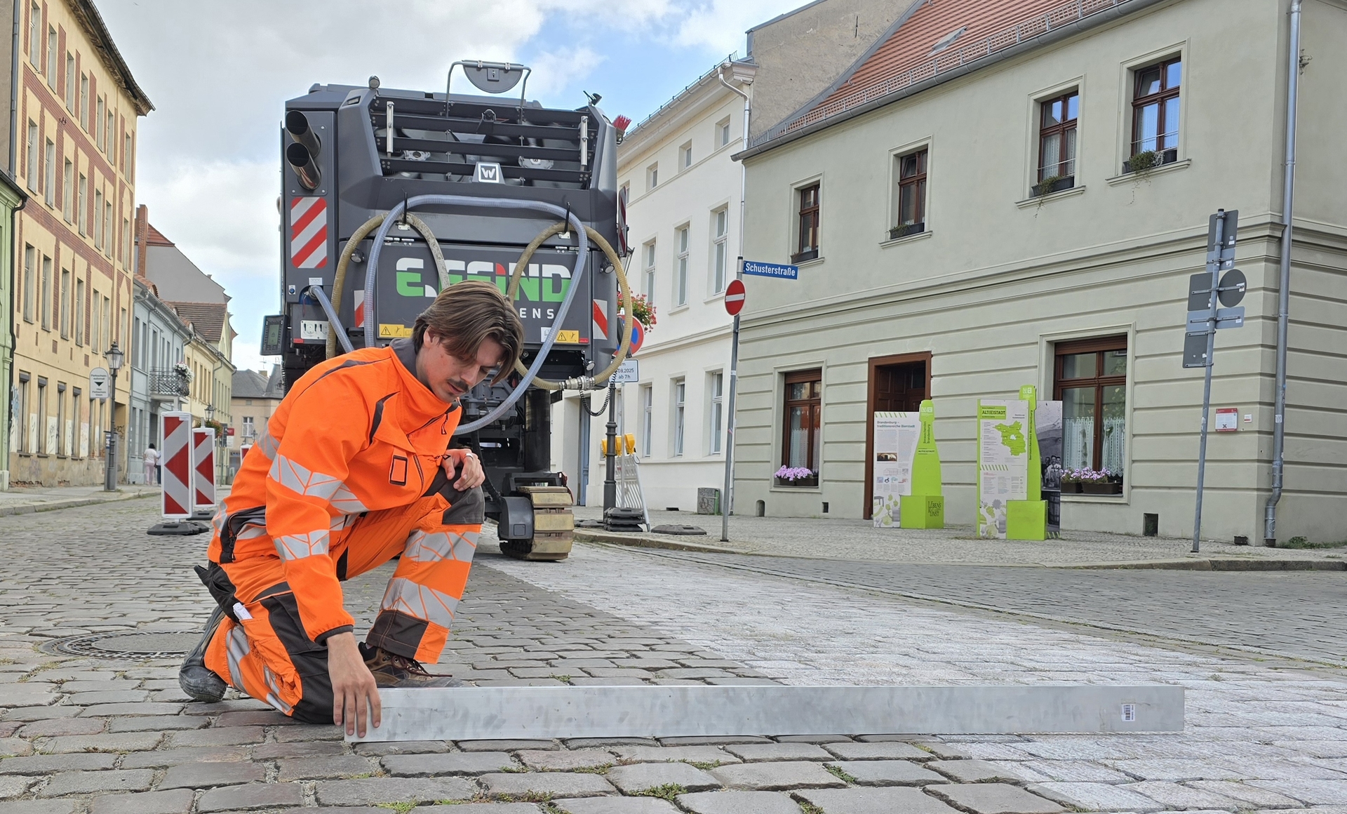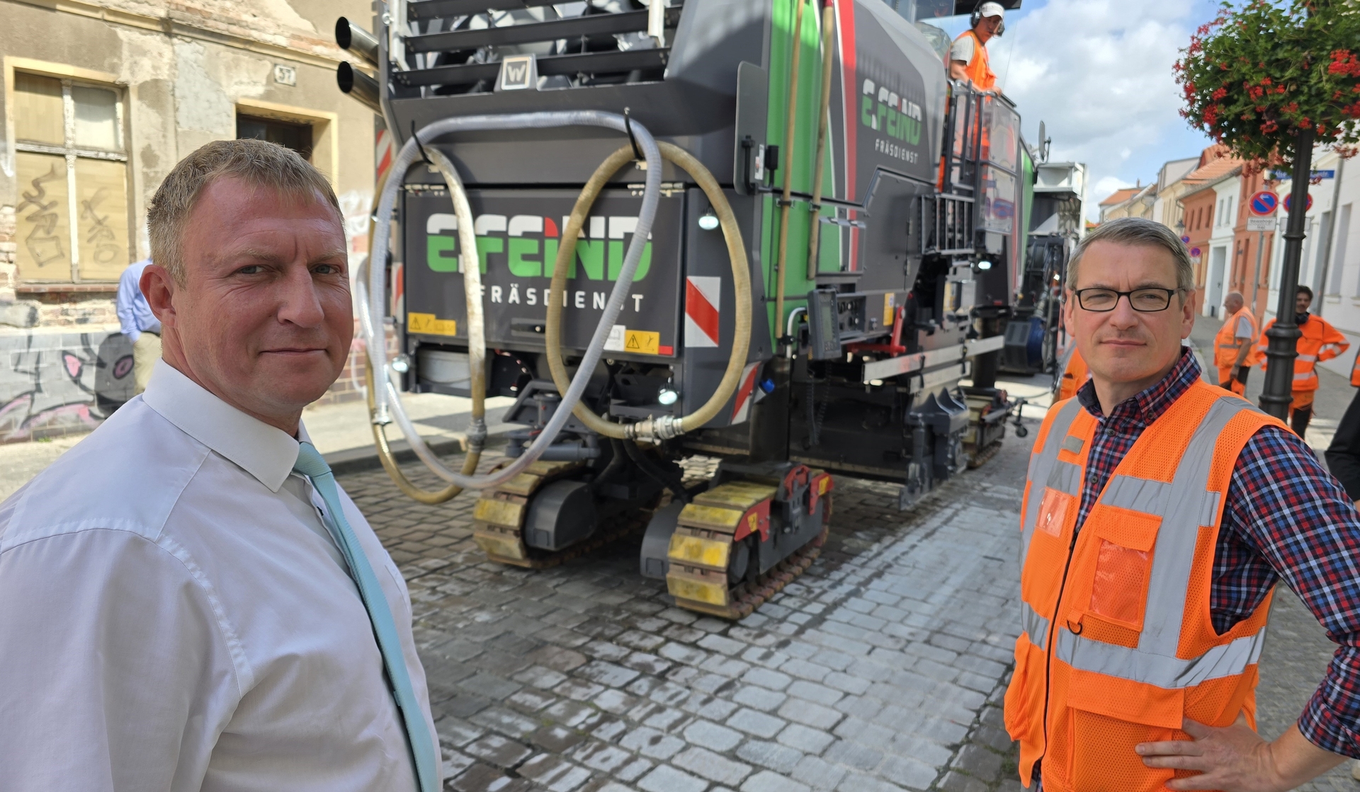 Das Verfahren ist seit einem halben Jahr in der Erprobung, hat erste vielbeachtete Teststrecken hervorgebracht – nun auch in Brandenburg an der Havel. In Abstimmung mit der Denkmalbehörde wurde sich eine Fahrbahnseite der Straße Parduin vorgenommen. Die gewaltige Maschine, vor der ein für Kühlwasser sorgender LKW fährt, ließ bei drei Fahrten das neue Herzstück aufs alte Pflaster wirken: eine 185 cm breite und mit 380 Diamanttrennscheiben besetzte, rotierende Welle. Wegen des guten Ergebnisses wurde sogleich noch das Anschlussstück zur Mühlentorstraße mit bearbeitet.