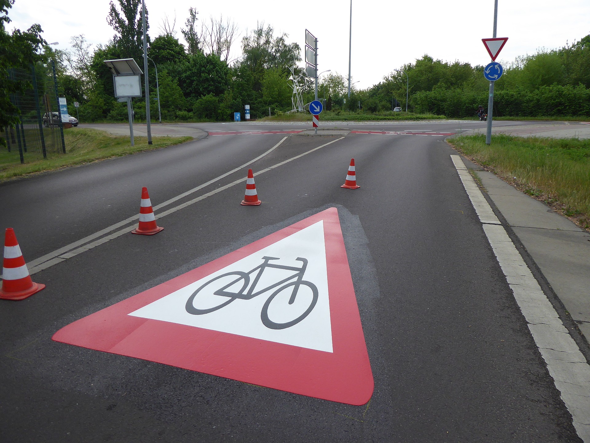 Bei einem durchgeführten Sicherheitsaudit konnten keine verkehrstechnischen Mängel festgestellt werden. Aus diesem Grund wurde als letzte mögliche Maßnahme zur Reduzierung der Unfälle mit Radfahrern die Markierung des Gefahrenzeichens „Achtung Radverkehr“ auf der Fahrbahn stadteinwärts vor dem Kreisverkehr angeordnet. Diese Markierung wurde heute durch eine Fachfirma aufgebracht.