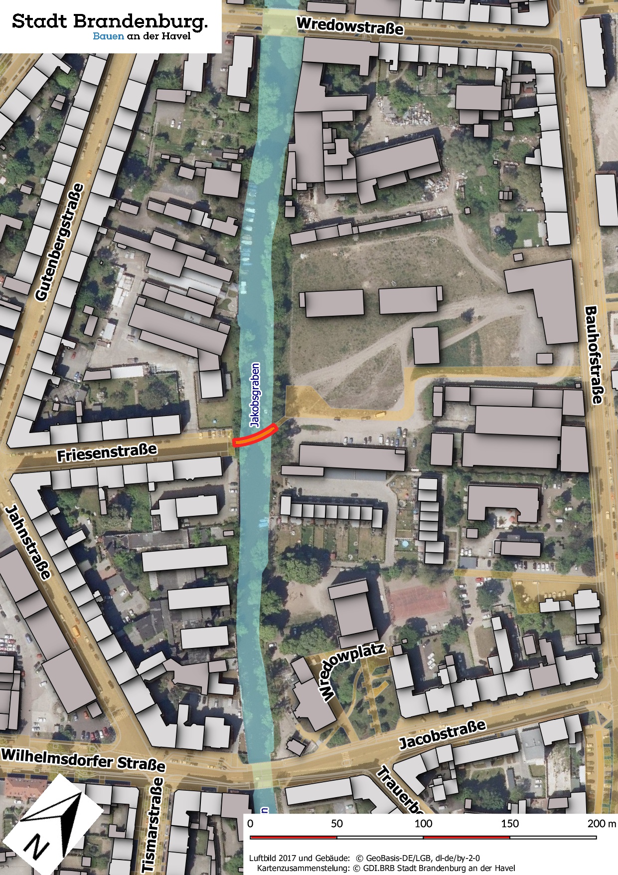 Die neue Brücke von der Friesenstraße über den Jakobsgraben zum Gelände des ehemaligen Busbetriebshofes stellt den Kernbaustein der neuen quartiersübergreifenden Wegeverbindung von der Friesenstraße (Stadtteil Ring) zur Stadtschleuse (Innenstadt) dar. Sie trägt somit maßgeblich zur nachhaltigen Entwicklung der Brachflächen entlang der Bauhofstraße sowie der weiteren Vernetzung attraktiver innerstädtischer Wegebeziehungen unabhängig vom Hauptstraßennetz bei.