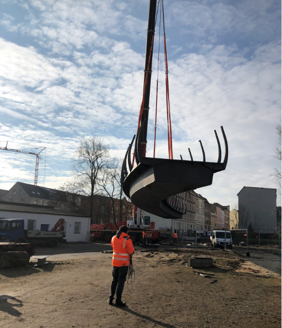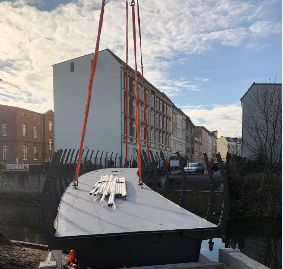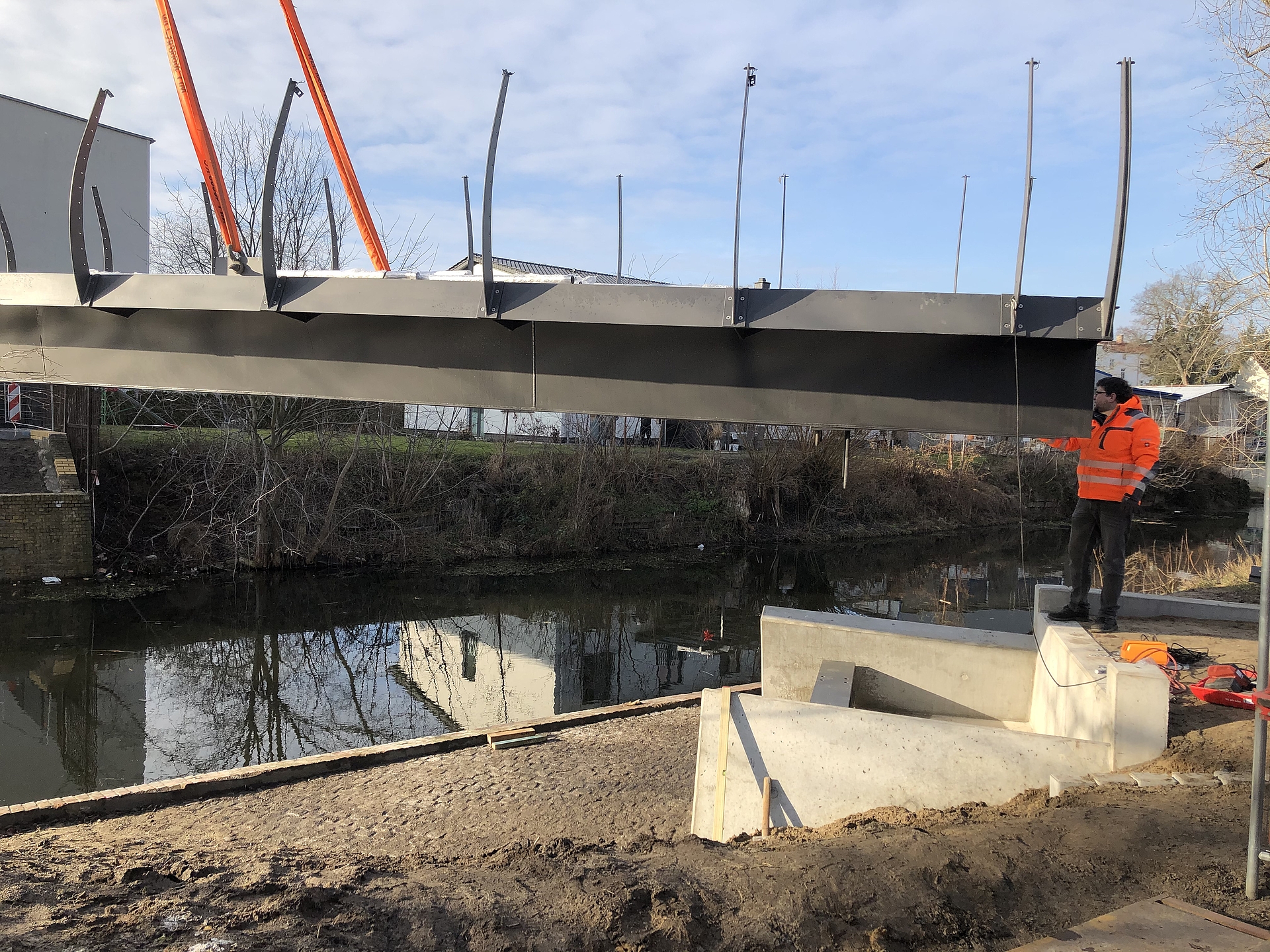 Am heutigen Mittwoch, dem 27.01.2021, wurde für die Wegeverbidnung Friesenstraße-Bauhofstraße im Beisein von Bürgermeister Michael Müller, Vertreter der beteiligten Fachbereiche der Stadtverwaltung sowie den Verantwortlichen der Bauausführung, nach Fertigstellung der Fundamente und Widerlager, die neue Geh- und Radwegbrücke über den Jakobsgraben, eingehoben.