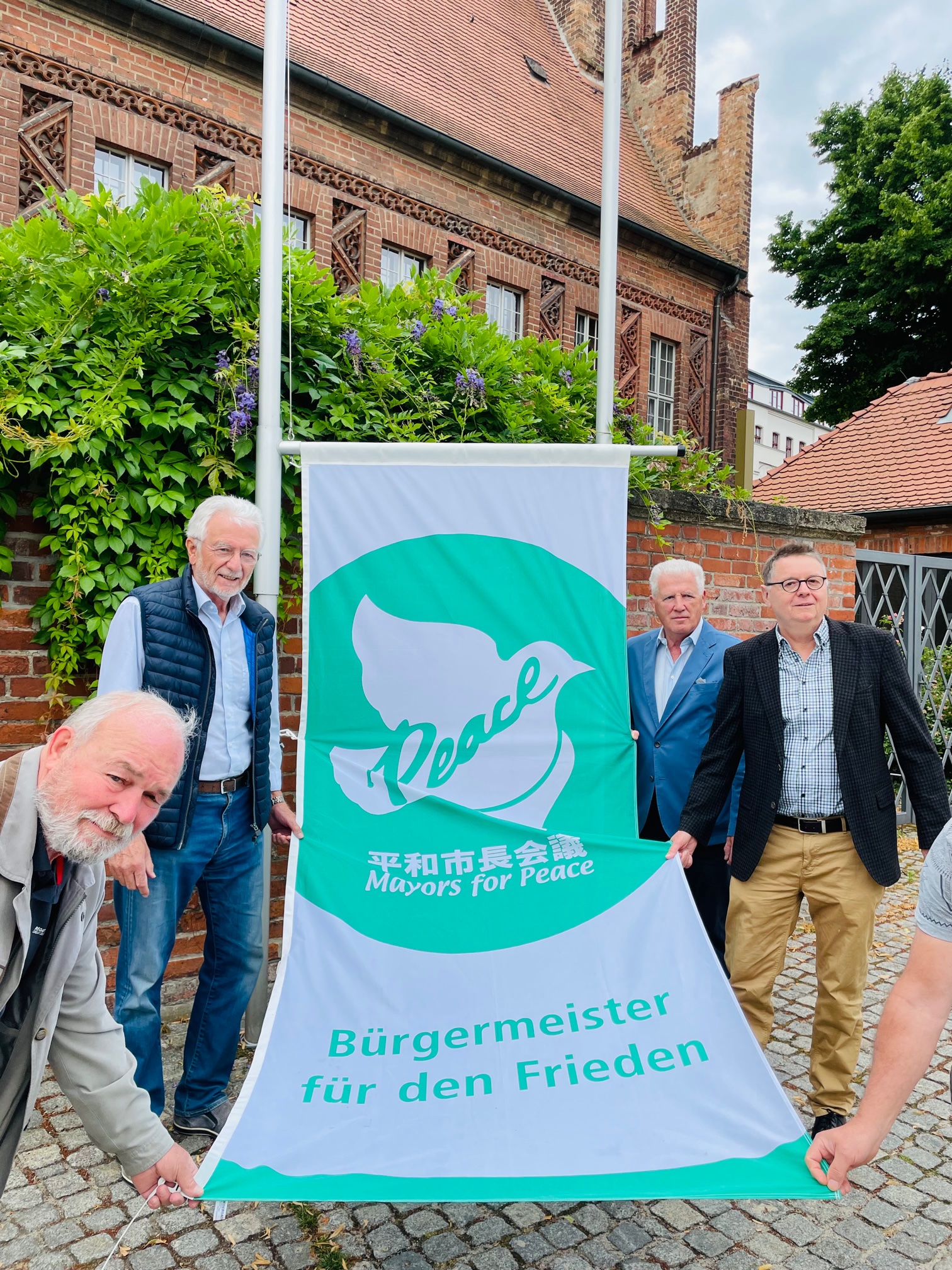 Gemeinsam mit Vertretern der Stadtverordnetenversammlung hat Walter Paaschen, Vorsitzender der Stadtverordnetenversammlung, am heutigen Donnerstag die Fahne „Mayors for Peace“ vor dem Altstädtischen Rathaus gehisst, um damit symbolisch ein Zeichen der Forderung nach einer Abschaffung aller Atomwaffen weltweit zu setzen.