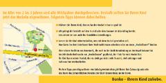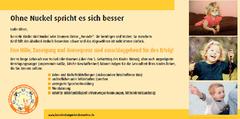 Der vom Zahnärztlichen Dienst und dem Büro der zahnärztlichen Gruppenprophylaxe im Land Brandenburg entwickelte Flyer „Ohne Nuckel spricht es sich besser“ liegt überall dort aus, wo Eltern erreicht werden können, in Kitas, Tagespflegestellen, Praxen, Behörden, der Kinderbibliothek etc..