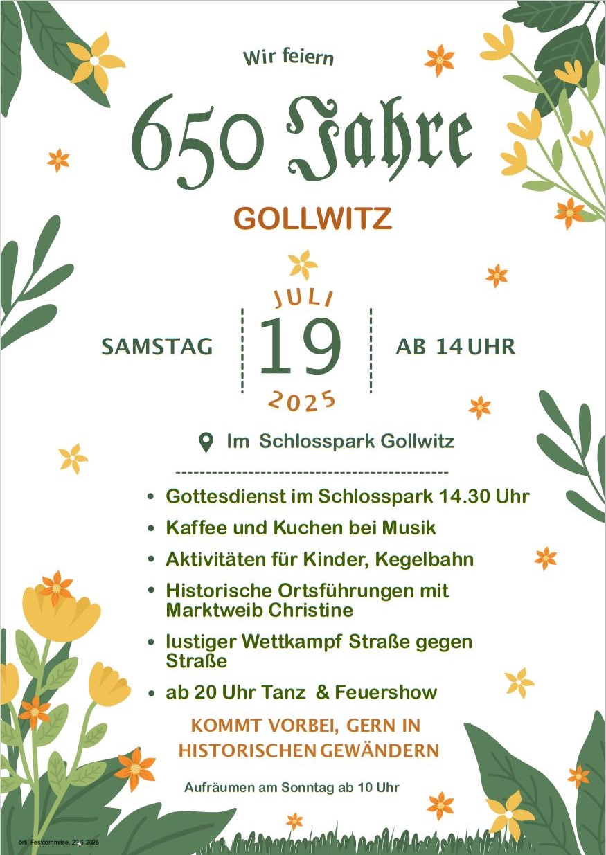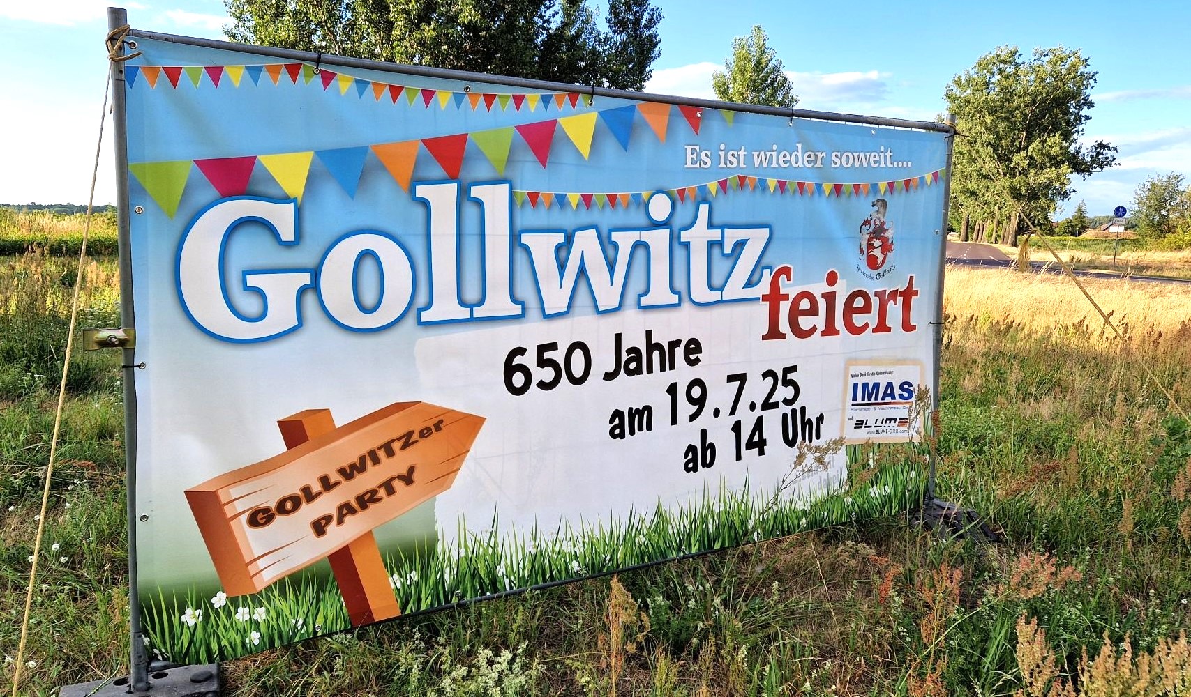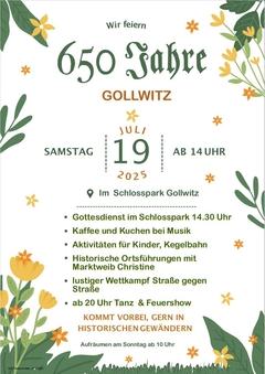 Gefeiert wird am Samstag, 19. Juli 2025, im Schlosspark und zwar ab 14:00 Uhr. Die kurzen Begrüßungsreden münden in einen Festgottesdienst, den Pfarrer Jens Meiburg hält und woran sich ein buntes Festgeschehen anschließt. Das darf laut Gastgebern gern in historischen Gewändern genossen werden. Gefeiert wird bei Kaffee, Kuchen und Musik, mit Aktivitäten für Kinder und beim Kegeln. Marktweib Christine lädt zu historischen Ortsführungen ein, bei denen die Gollwitzer Denkmäler wie das „Schloss“ mit Schlosspark und Speichergebäude sowie die Dorfkirche samt Glocke (von 1691!), Kirchhofmauer, Friedhofskapelle und der Grabstätte der Familie von Rochow sicher eine Rolle spielen werden. Lustige und rustikale Spiele sind sodann beim traditionsreichen „Wettbewerb Straße gegen Straße“ zu erwarten, bevor ab 20:00 Uhr der Tanz – mit LED-Show – beginnt.