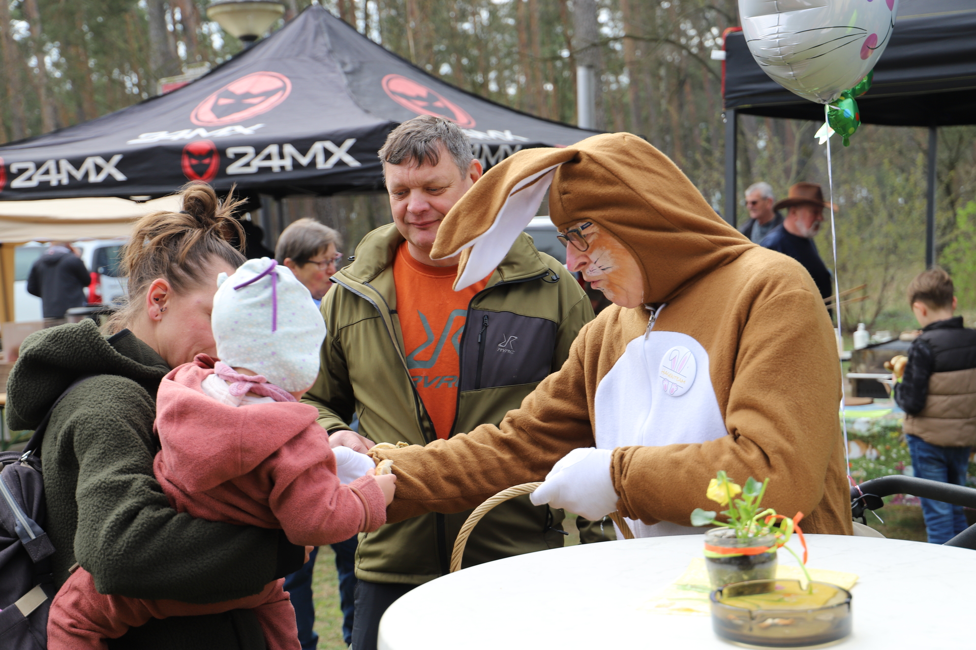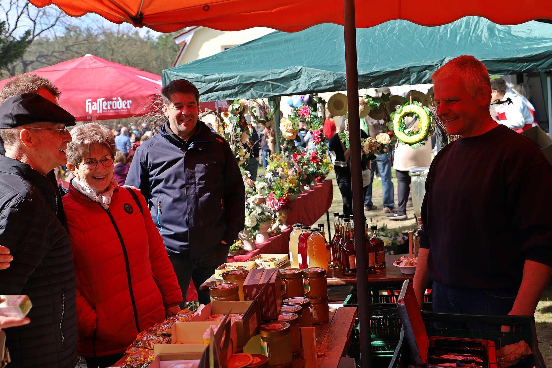 An anderen Ständen konnten sorbische Ostereiermalereien, Osterklöppeleien, Korbflechterei, Stickereien und Holzschnitzkunst gekauft werden. Regionale Erzeuger präsentieren hausgemachte Spezialitäten, darunter Honigprodukte, Pralinen, Liköre und Pesto. Für Liebhaber traditioneller Handwerkskunst gab es Keramik, Wachskerzen, Ton- und Holzarbeiten sowie Blumen-Deko-Kränze zu entdecken. „Osterhase“ Rainer Schebitz verteilte süße Überraschungen an die Besucherinnen und Besucher. Er ist ehemaliger Mahlenziener und wohnt jetzt in Niedersachsen. Aber beim Osterbaumfest helfen er und seine Frau Sylvia, die am Kuchenstand die Gäste verwöhnte, alljährlich.