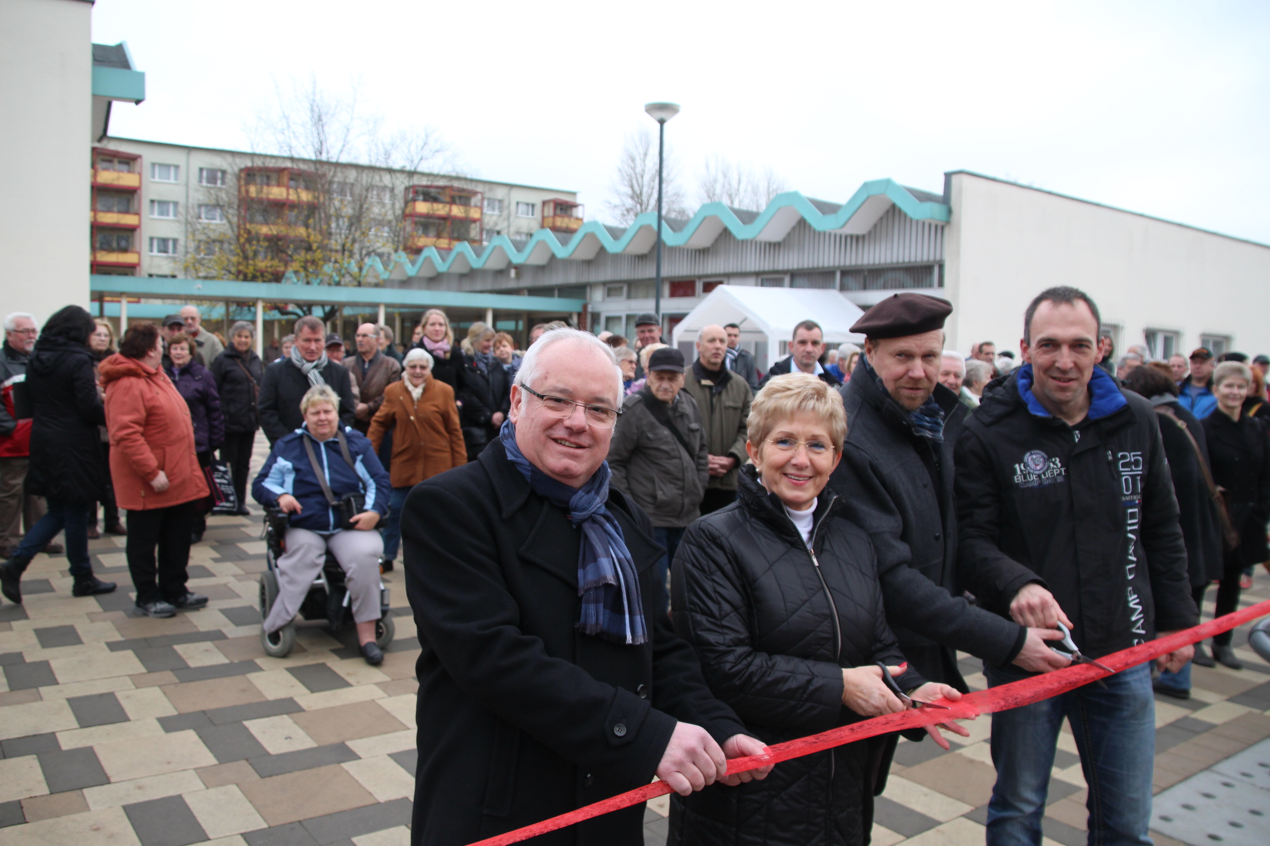 Am Montag, 07.12.2015, weihte Oberbürgermeisterin Dr. Dietlind Tiemann gemeinsam mit Vertretern der Baufirmen und Wohnungsgenossenschaft die neugestaltete Grünachse Marienberg-Nord ein. In ca. 14 Monaten Bauzeit wurde der öffentliche Bereich zwischen Willi-Sänger-Straße und Bertolt-Brecht-Gymnasium nahezu komplett umgestaltet. Die Freiherr-von-Thüngen-Straße einschließlich der Geh- und Radwege auf beiden Seiten, der Marktbereich sowie der Vorplatz des Gymnasiums erstrahlen in neuem Glanz. Das gesamte Bauvorhaben wurde schrittweise in 4 Bauabschnitten umgesetzt. Aufgrund der vielen Beteiligten und besonderer zu berücksichtigender Rahmenbedingungen, wie zum Beispiel der ununterbrochene Betrieb des Wochenmarktes, war das eine große Herausforderung. Einige Restarbeiten werden noch bis Jahresende abgeschlossen sein.