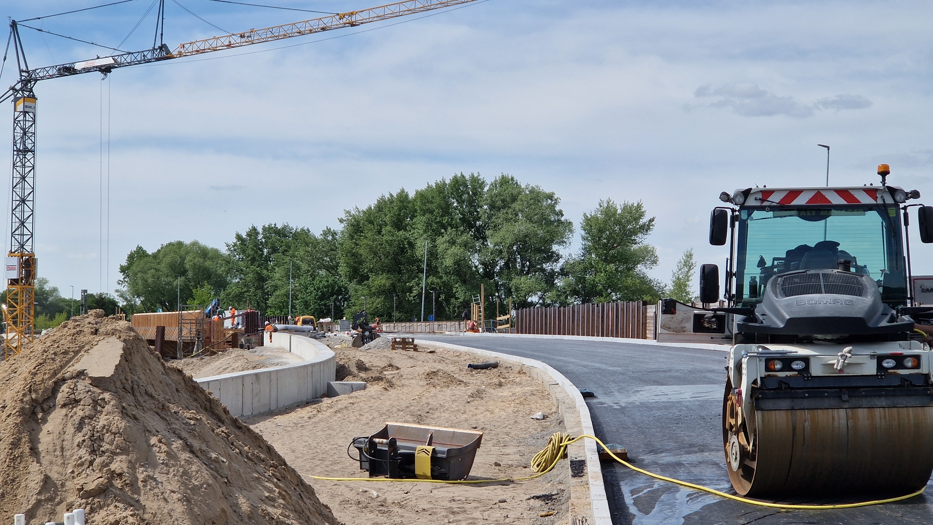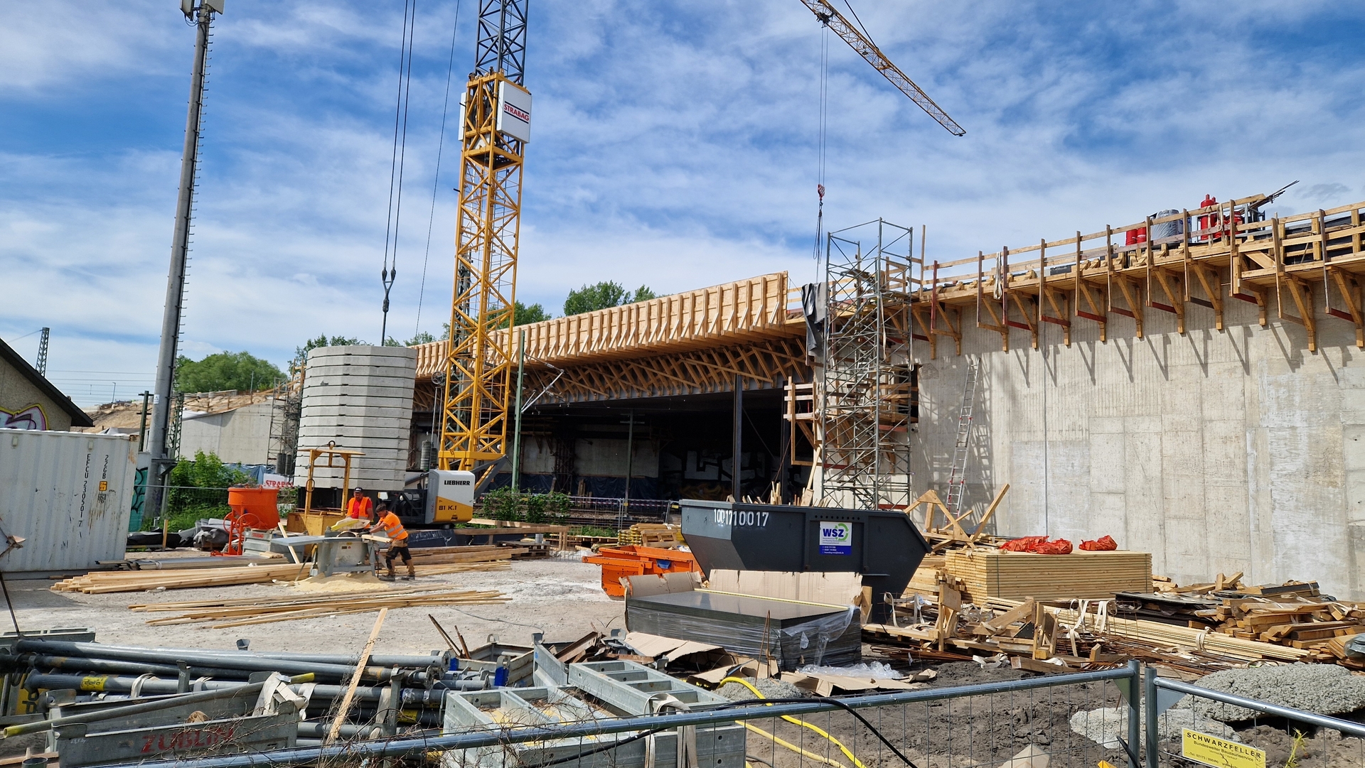 Um schnellstmöglich voranzukommen, ist der Bauzeitplan weiterhin eng getaktet – sodann für die stadteinwärtige Fahrspur. Bereits für Mitte Juni ist das Ausheben des alten Brückenbauwerkes vorgesehen, wofür dann wieder monumentale Kräne in Stellung zu bringen sind. Sie werden voraussichtlich beidseits der Brückenrampen aufgebaut und die Stahlträger halbiert herausheben. Für Juli ist der Abbruch der Widerlager und Flügelwände vorgesehen. Sodann geht es bautechnisch erst wieder in die Tiefe, bevor die beiden Teilbauwerke der Brücke über die Bahn sowie über den Neujahrsgraben entstehen können. Den Arbeiten im Bereich der Rampen geht das Setzen von Stützwänden über eine Länge von 650 Metern voraus, um die Stabilität der Fahrbahn gewährleisten zu können, ohne mit weit auslaufenden Böschungen ins Naturschutzgebiet eingreifen zu müssen.