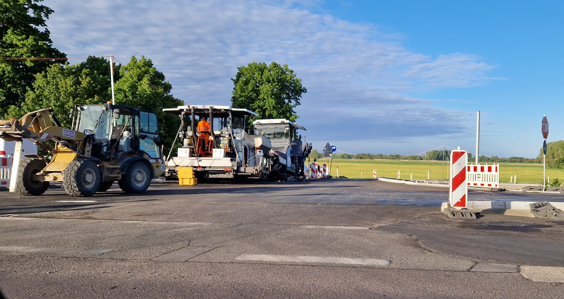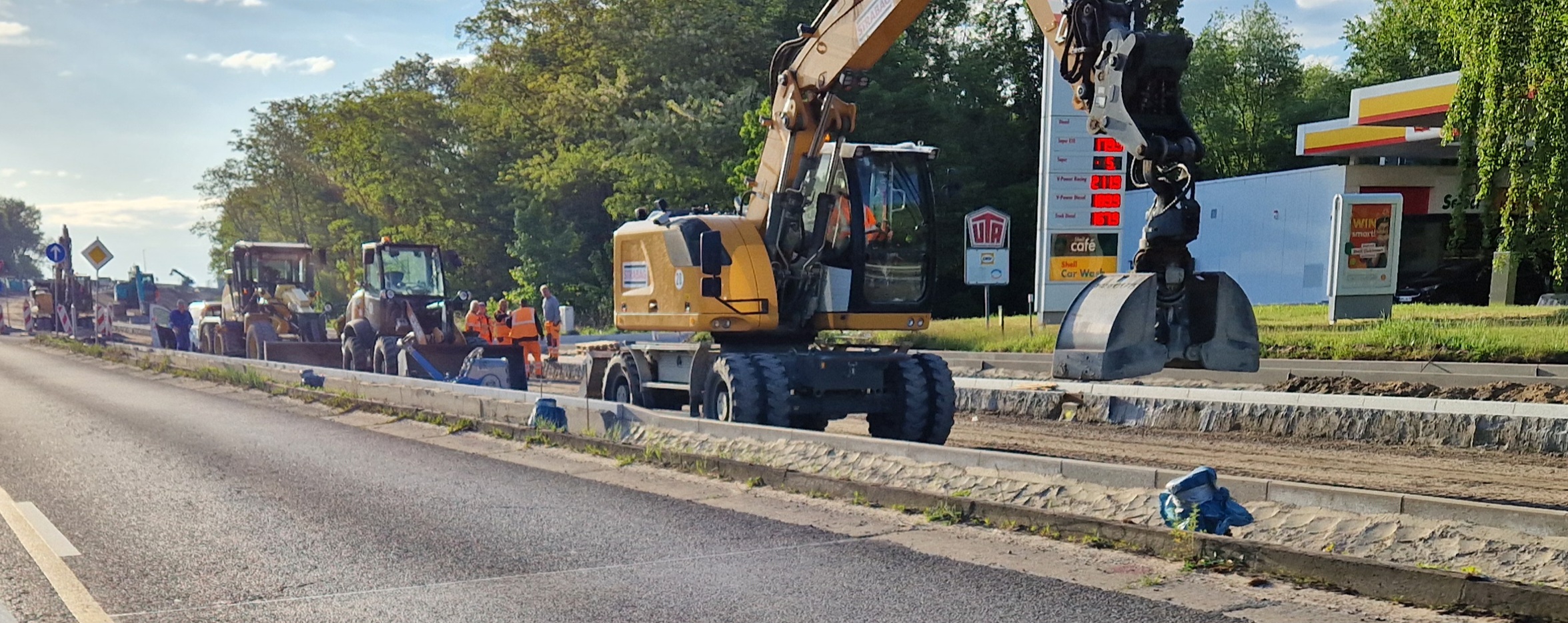 Während der vergangenen Wochen zeigt sich auf der Großbaustelle in der Potsdamer Straße auch Nicht-Bausachverständigen, dass es kräftig vorangeht. Seit die aufwendigen Vorarbeiten im Untergrund und an der Überbrückung der Bahnlinie bewältigt werden konnten, sind das schnelle Wachsen der Bordstreifen und das Verdichten von Betonrecycling als Straßenuntergrund ein eindeutiger Indikator für die Zielgerade. Seit Montag auch die Asphaltflotte im Einsatz ist, wird der Baufortschritt noch deutlicher.