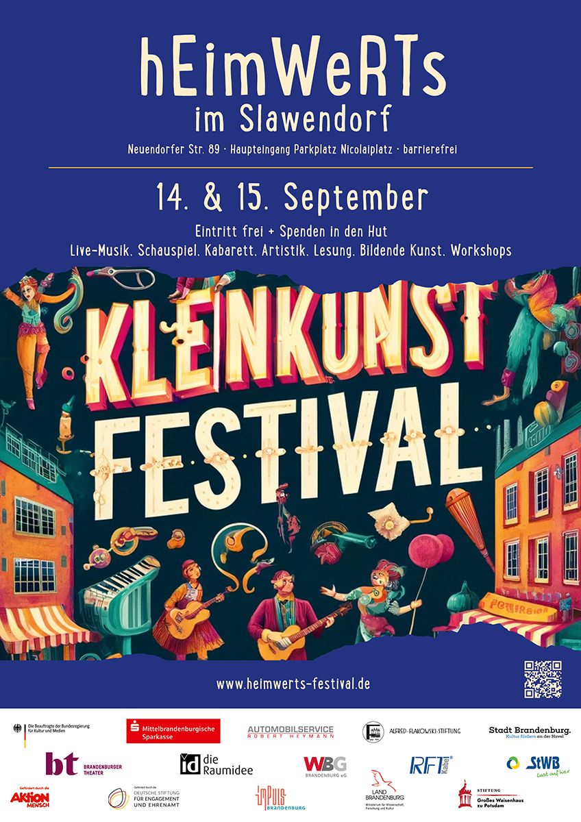 Das 12. „hEimWeRTs“-Kleinkunstfestival findet am 14. und 15. September 2024 jeweils ab 13 Uhr im Slawendorf in der Neuendorfer Straße 89 (Haupteingang Parkplatz Nicolaiplatz) statt. Einlass ist ab 12:30 Uhr. Der Eintritt ist frei. Die Musikerinnen und Musiker, Künstlerinnen und Künstler sowie sonstige Akteure freuen sich über Spenden in den Hut.
