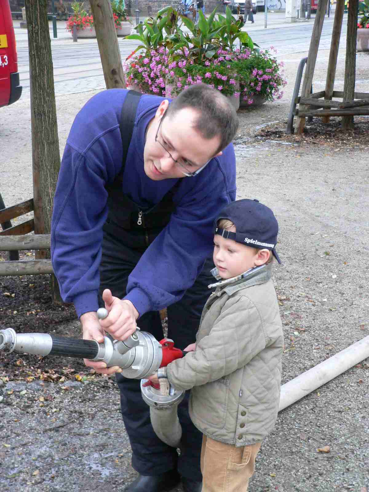 Übrigens: Das Wasser erfüllte nach Beendigung des Städteduells noch eine gute Funktion. Kameraden der Feuerwehr pumpten den Pool leer und wässerten – mit Unterstützung kleiner Helfer – die Bäume rings um den Neustädtischen Markt.