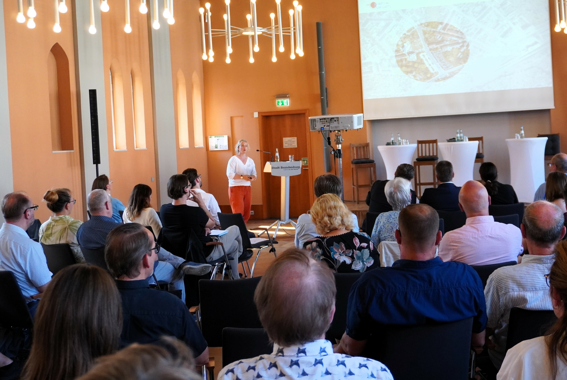 Jeannine Albrecht, Amtsleiterin für Stadtentwicklung und Denkmalschutz in der Stadt Brandenburg an der Havel, stellte das aktuelle städtische Modellvorhaben vor, das zusammen mit der Technischen Hochschule Brandenburg realisiert wird. Die künftige klimaangepasste Gestaltung der südlichen Bauhofstraße im gründerzeitlichen Bahnhofvorstadt soll in einem digitalen und analogen Beteiligungsprozess in einer Art Reallabor mit kleinteiligen Maßnahmen mit Bürgerinnen und Bürgern und in Fachgremien diskutiert werden. Digital können Interessierte auf spielerische Weise über eine App z. B. die Straßenränder nach ihren Vorstellungen gestalten.
