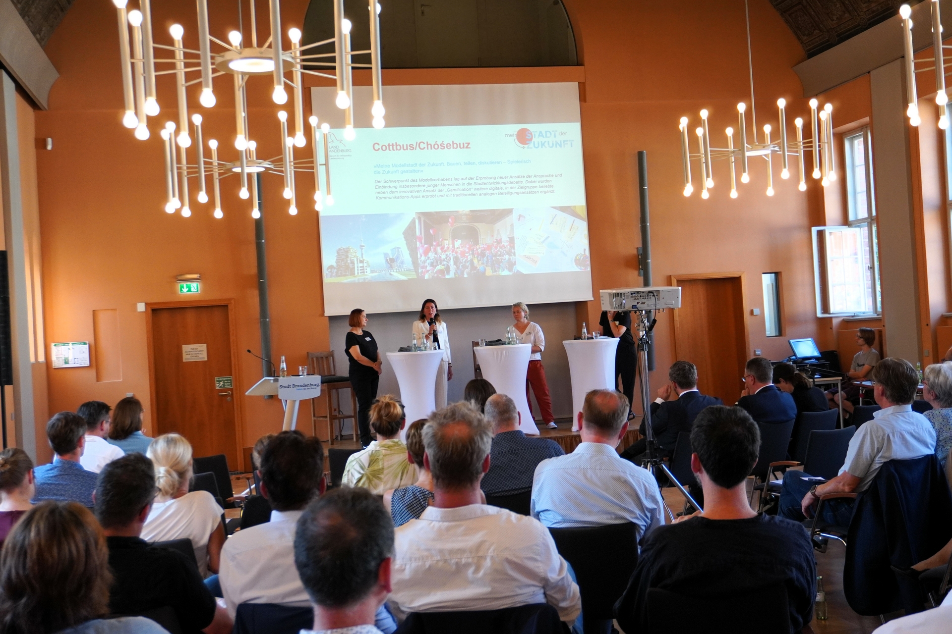 Die Landesinitiative „Meine Stadt der Zukunft“ beschäftigt sich mit bau- und raumrelevanten Zukunftsthemen wie der Bewältigung des Klimawandels, lokaler Energie-/Wärmeplanung oder umweltgerechte innerörtliche Mobilität, digitaler Transformation und einer gemeinwohlorientierten Stadtentwicklung. Zum einen unterstützt das MIL die ausgewählten Kommunen beratend und finanziell bei der Durchführung ihrer Modellvorhaben. Zum anderen entfaltet die Landesinitiative ihre Wirksamkeit über die Modellstädte hinaus. Mit einem kontinuierlichen Austausch zwischen den Städten wird Expertenwissen besser in der Breite und für alle zugänglich gemacht. Die Zwischenbilanzkonferenz hat allen Brandenburger Kommunen und Fachinteressierten die Möglichkeit gegeben, Einblicke in die bisherige Arbeit der Modellvorhaben zu erhalten.