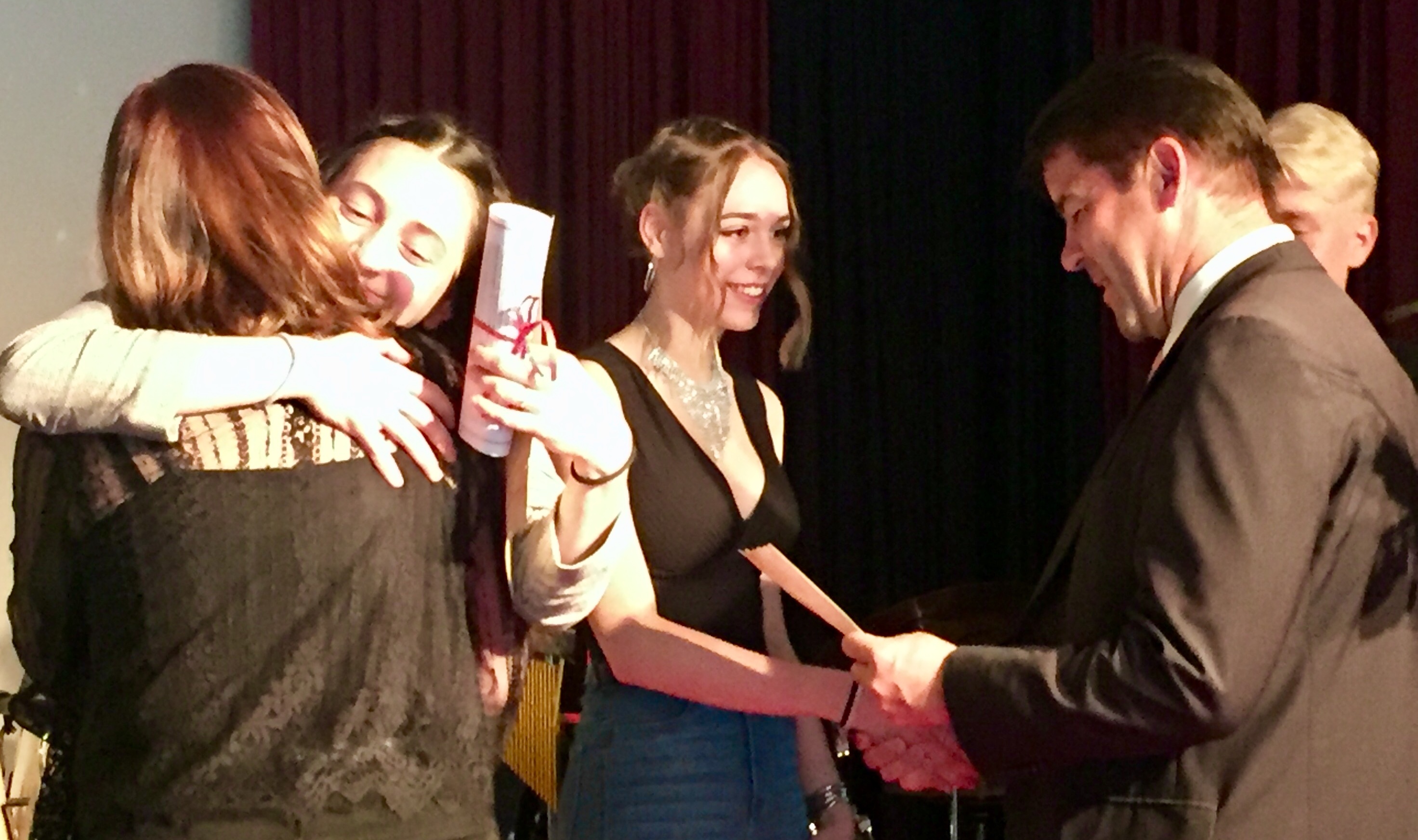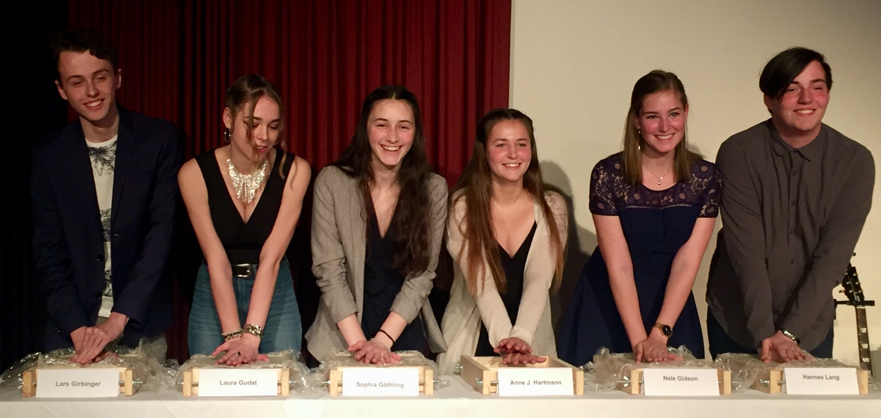 Neben den Urkunden wurde den Preisträgerinnen und Preisträgern die Ehre zuteil, dass ihr in Ton gebrannter Handabdruck mit einem Namensschild im Eingangsbereich der Schule an der „Wall of Fame“ aufgehängt wird.