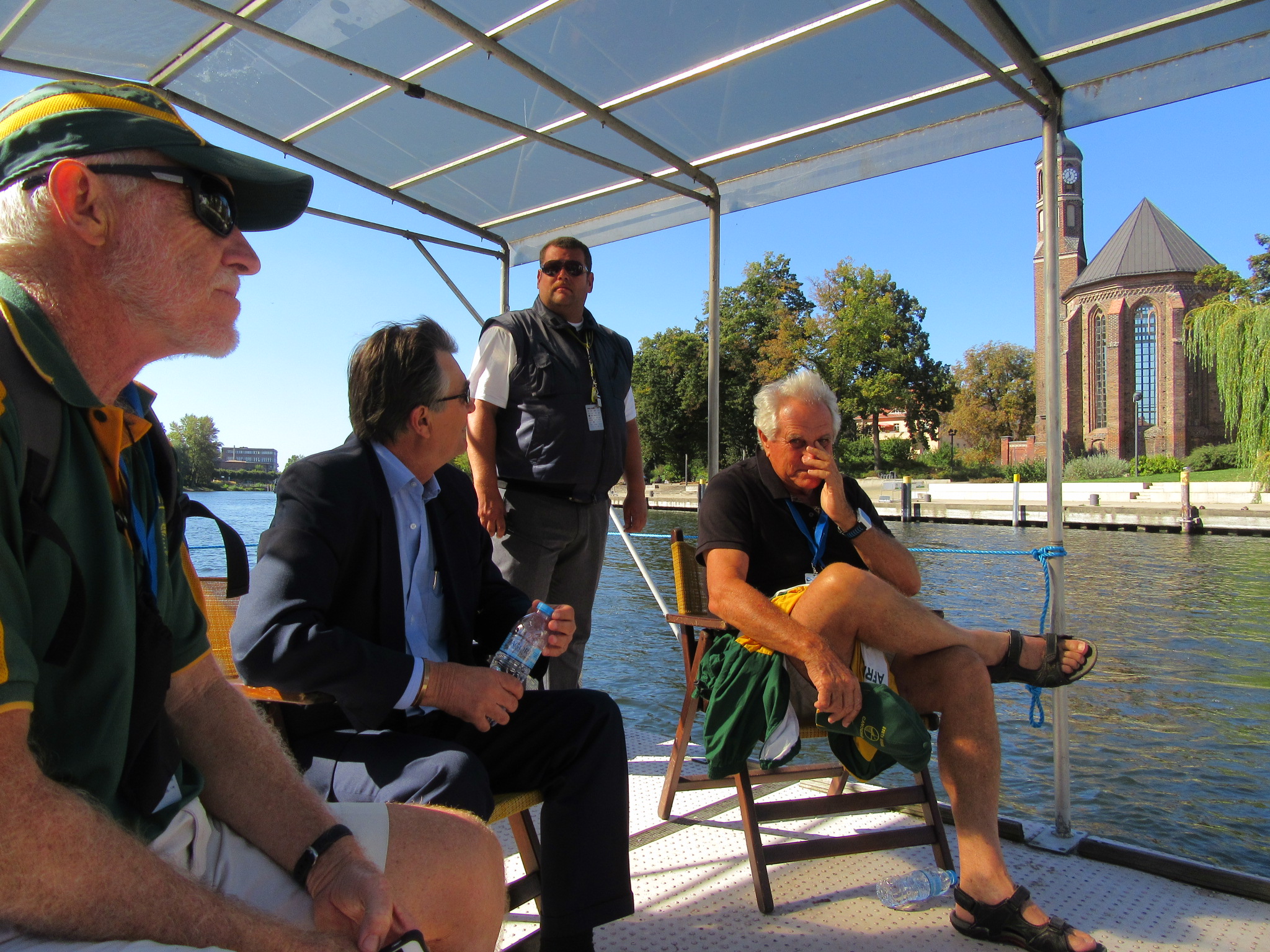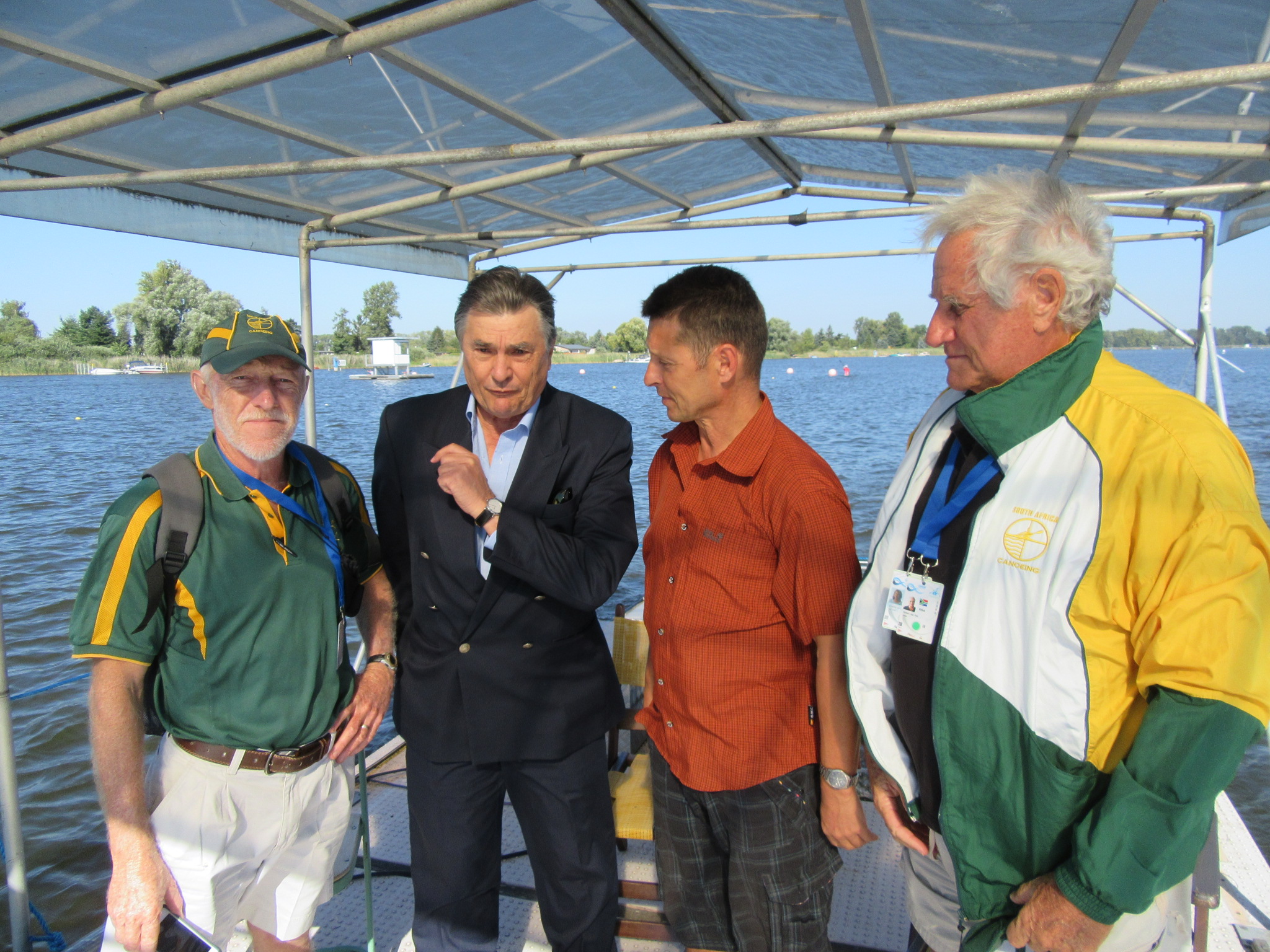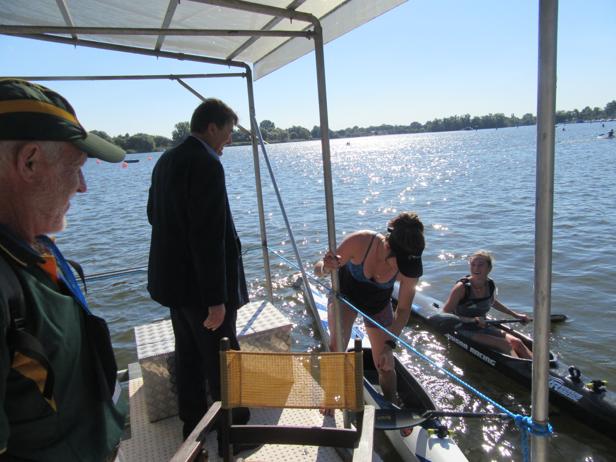 Zunächst zeigte er dem hohen Gast von einem Katamaran vom Wasser aus die Regattastrecke und machte gemeinsam mit ihm und Vertretern der südafrikanischen Mannschaftsleitung auch einen kleinen Abstecher in die Innenstadt. Wieder an Land, ging es auf den Zielturm, wo die anwesenden Jury-Mitglieder des Kanu-Weltverbandes die Wettkampftechnik erklärten und den Regattaablauf erläuterten. Danach wurde noch die „Boat-Area“, also der sogenannte „Sattelplatz“, besichtigt, wo die internationalen Teams ihre Boote auf den Wettkampf vorbereiten und sich selbst auf die anstrengenden Entscheidungen einstimmen. Der südafrikanische Diplomat lobte die weitläufig, naturbelassene und hochmoderne Brandenburger Regattaanlage.