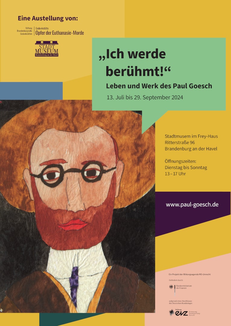 Die Ausstellung im Stadtmuseum Brandenburg an der Havel, Ritterstraße 96, zeigt dienstags bis sonntags von 13:00 bis 17:00 Uhr mehr als 30 Originalwerke des Künstlers und schildert seine Lebensgeschichte. Aufgrund einer psychischen Erkrankung verbrachte Paul Goesch ab 1921 einen Großteil seines Lebens in verschiedenen psychiatrischen Einrichtungen, wo er weiter malte. 1940 wurde er von den Nationalsozialisten in der „Euthanasie“-Tötungsanstalt Brandenburg an der Havel ermordet.