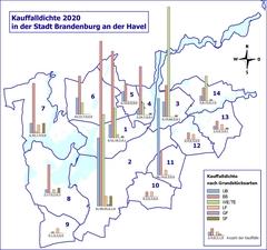 Im Jahr 2020 registrierte der Gutachterausschuss für Grundstückswerte in der Stadt Brandenburg an der Havel 670 Kauffälle mit einem Geldumsatz von 176,6 Millionen Euro und einem Flächenumsatz von 150,7 Hektar. Aus dem nachfolgendem Diagramm ist die Umsatzentwicklung der letzten zehn Jahre ersichtlich.