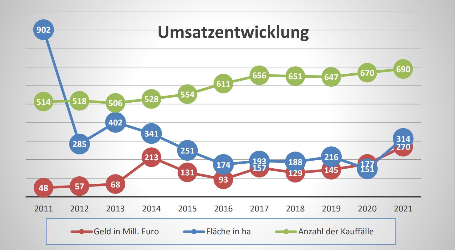 Im Jahr 2021 registrierte der Gutachterausschuss für Grundstückswerte in der Stadt Brandenburg an der Havel 690 Kauffälle mit einem Geldumsatz von 270,1 Millionen Euro und einem Flächenumsatz von 314,4 Hektar. Aus dem Diagramm (siehe nebenstehende Grafik 1) ist die Umsatzentwicklung der letzten zehn Jahre ersichtlich.