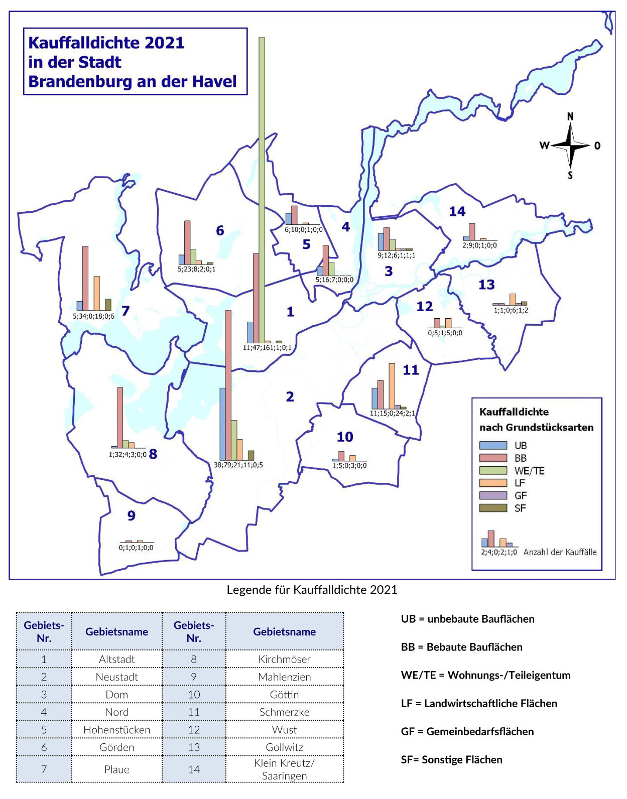 Der Grundstücksmarktbericht 2021 über die Stadt Brandenburg an der Havel gibt eine ausführliche Bestandsaufnahme des Immobilienmarktes 2021 wieder. So werden Umsatzzahlen, Preise für Immobilien aller Art, Preisentwicklungen, Marktanpassungsfaktoren, Vergleichsfaktoren, Liegenschaftszinssätze unter anderem übersichtlich und anschaulich dargestellt. Auch Eckdaten zur Bevölkerung, Wirtschaft, Kultur und Bildung runden den Überblick zu den wertrelevanten Gegebenheiten ab.