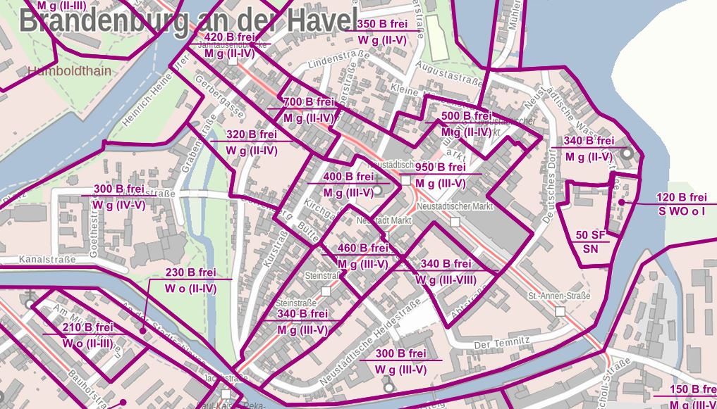 - Die Bodenrichtwertzonen im Kern der Stadt Brandenburg an der Havel wurden zum 01.01.2023 neu gegliedert bzw. generalisiert. Grund dafür war die Aufhebung des Sanierungsgebietes zum 31.12.2021.
