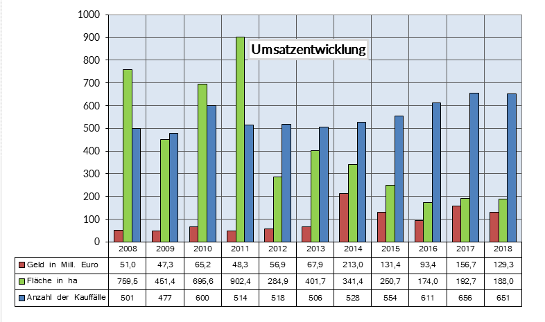 Im Jahr 2018 registrierte der Gutachterausschuss für Grundstückswerte in der Stadt Brandenburg an der Havel 651 Kauffälle mit einem Geldumsatz von 129,3 Millionen Euro und einem Flächenumsatz von 188 Hektar. Aus dem nebenstehendem Diagramm ist die Umsatzentwicklung der letzten Jahre ersichtlich.