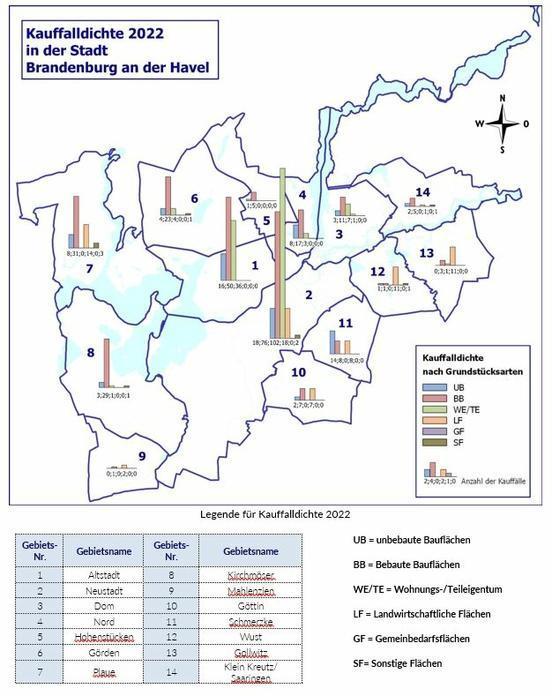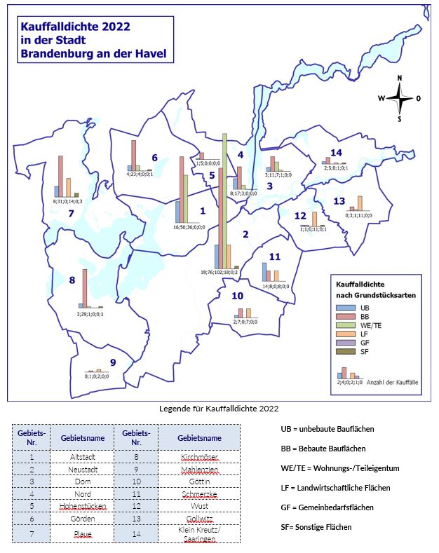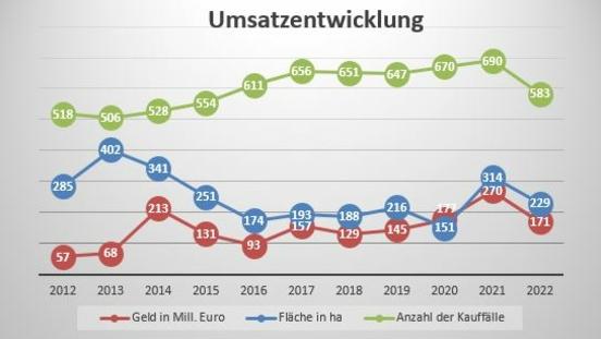 Im Jahr 2022 registrierte der Gutachterausschuss für Grundstückswerte in der Stadt Brandenburg an der Havel 583 Kauffälle mit einem Geldumsatz von 171 Millionen Euro und einem Flächenumsatz von 229 Hektar. Alle Umsätze sind gegenüber dem Vorjahr stark gesunken. Aus dem nachfolgendem Diagramm (siehe nebenstehende Grafik 1) ist die Umsatzentwicklung seit 2012 ersichtlich.