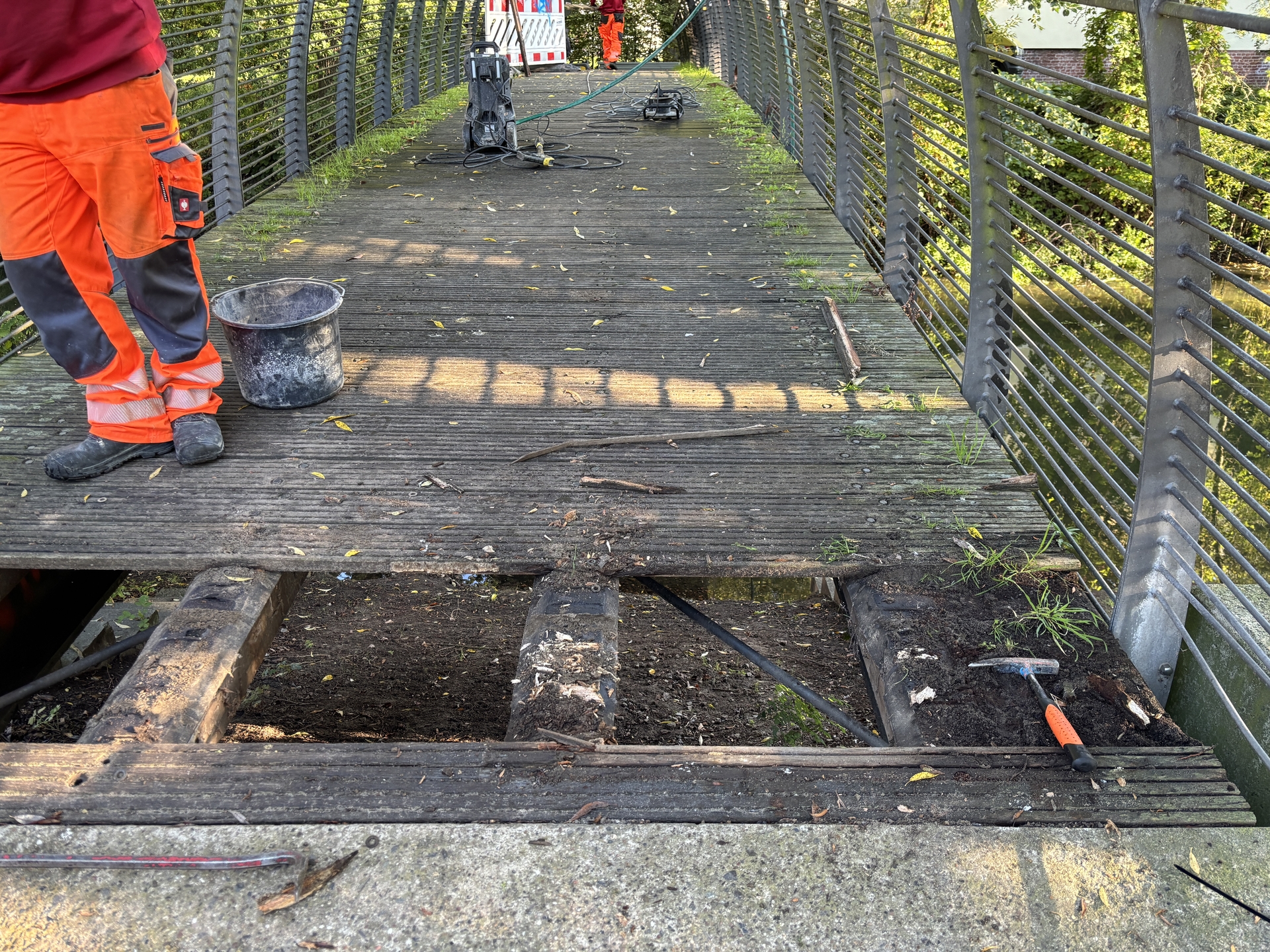 Seit dieser Woche wird die Geh- und Radwegbrücke über den Jakobsgraben umfassend instandgesetzt. Der bisherige Holzbelag wird vollständig entfernt und durch einen modernen, langlebigen Belag aus glasfaserverstärktem Recycling-Kunststoff ersetzt. Dieses Material verfügt über eine bauaufsichtliche Zulassung und bietet zahlreiche Vorteile: Es ist verrottungsfest, rutschhemmend, wasserabweisend, frostsicher sowie resistent gegen Insekten-, Pilz- und Bohrmuschelbefall. Zudem ist es recyclebar, ungiftig und benötigt keine Nachbehandlung – regelmäßige Reinigung reicht für den Erhalt aus.