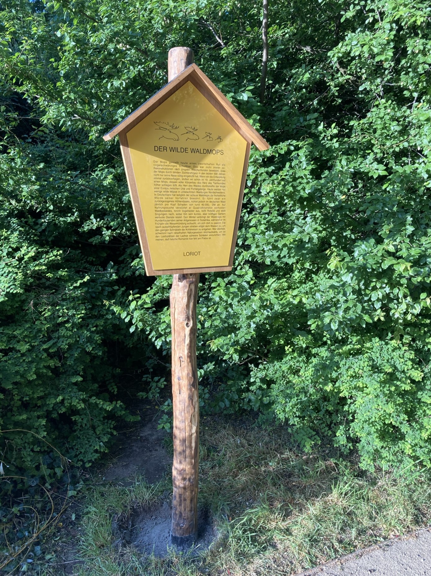 Außerdem informiert eine Tafel – in Anmutung eines Naturschutzschildes – am Eingang des Humboldthains ausführlich über die Entstehung und Geschichte des Mopses und zwar mit Loriots Text aus dem Sketch „der wilde Waldmops“.