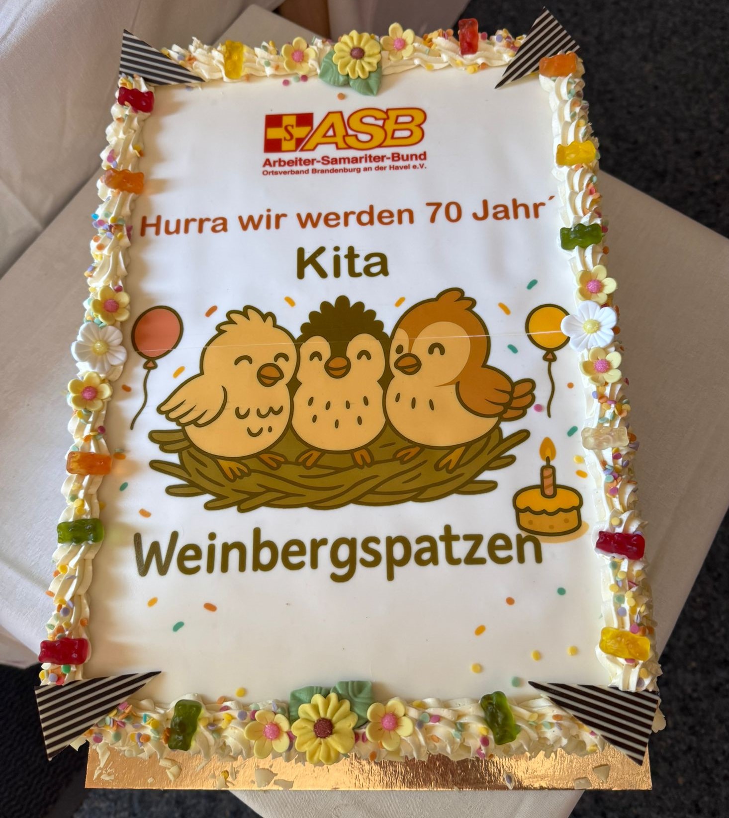 Vier Tage, nachdem der ASB-Ortsverband Brandenburg e.V. sein 35-jähriges Bestehen im Audimax groß gefeiert hat, stand für den Arbeiter-Samariter-Bund das nächste Jubiläum ins Haus. Allerdings konnte die ASB-Kita „Weinbergspatzen“ im Ortsteil Göttin die Jubiläumszahl sogleich verdoppeln, weil sie bereits 1955 als sogenannte Ernte-Kita entstanden war. Seit 1990 ist der ASB-Ortsverband Träger der Einrichtung, der außerdem noch die Kita „Stoppelhopser“ im Akazienweg 2 in der Scholle-Siedlung betreibt.