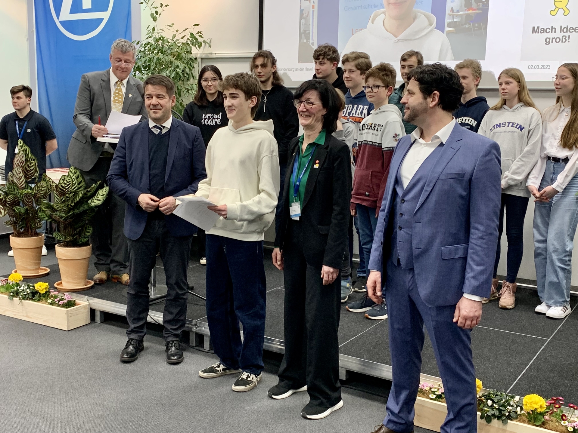 Anlässlich der Abschlussveranstaltung und Preisverleihung des Regionalwettbewerbs Brandenburg-West 2023 „Jugend forscht – Schüler experimentieren“ waren Brandenburgs Landesministerin für Bildung, Jugend und Sport Britta Ernst und Oberbürgermeister Steffen Scheller am Donnerstagnachmittag, 2. März 2023, zu Gast im Technologie- und Gründerzentrum.