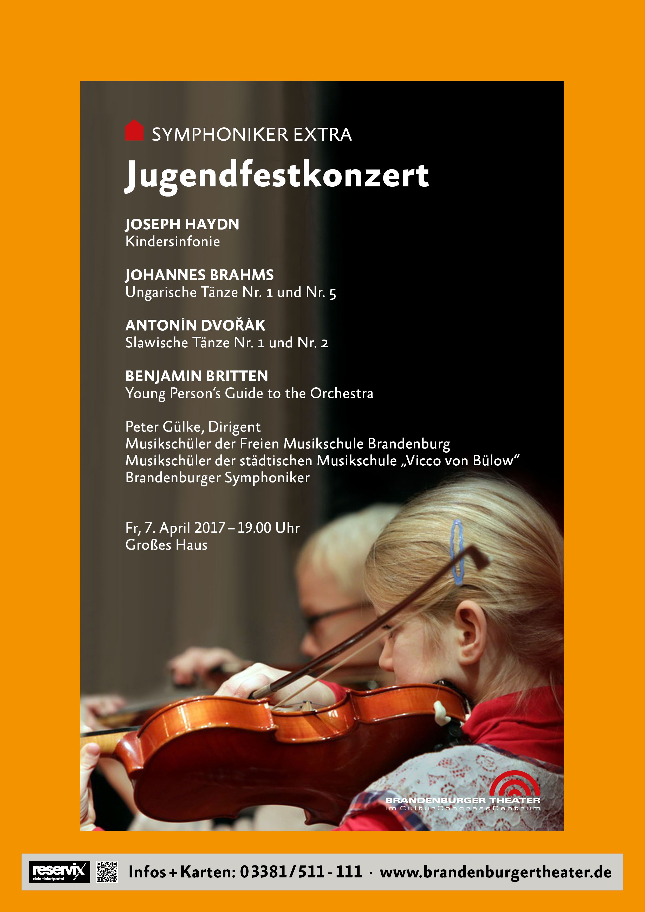 Am Freitag, dem 7. April 2017, findet um 19:00 Uhr im Brandenburger Theater das Jugendfestkonzert statt, ein Bildungsprojekt zur Förderung von Nachwuchs-Musikern. Es ist das erste Mal, dass Musikschülerinnen und Musikschüler der Brandenburger Musikschulen, Musikschule „Vicco von Bülow“ der Stadt Brandenburg an der Havel und Freie Musikschule Brandenburg, mit den Brandenburger Symphonikern am Pult sitzen und gemeinsam musizieren.