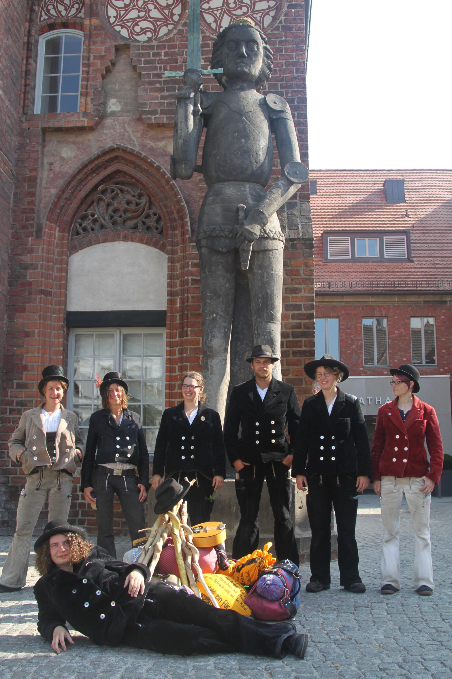 Heute begab sich die junge Brandenburgerin Josepha Nordhorst auf die traditionelle Wanderschaft als Zimmerin. In Begleitung von sechs erfahrenen Gesellinnen und Gesellen bat Josepha Nordhorst im Altstädtischen Rathaus um das so genannte Zehrgeld und das Dienstsiegel der Stadt Brandenburg an der Havel. Für mindestens drei Jahre und einen Tag wird sie auf „Tippelei“ gehen und von dem leben, was sie sich erarbeitet. Auf ihrer Wanderschaft wird die junge Handwerkerin fremde Kulturen, aber auch Arbeitstechniken und -praktiken kennenlernen. Nach einem abschließenden Foto vor dem Roland machte sich die Gruppe durch die Innenstadt in Richtung Mötzow auf. Nach den drei Jahren wird Josepha Nordhorst wieder im Altstädtischen Rathaus ankommen und das letzte Siegel in ihr Reisetagebuch eintragen lassen; das ihrer Heimatstadt Brandenburg an der Havel.