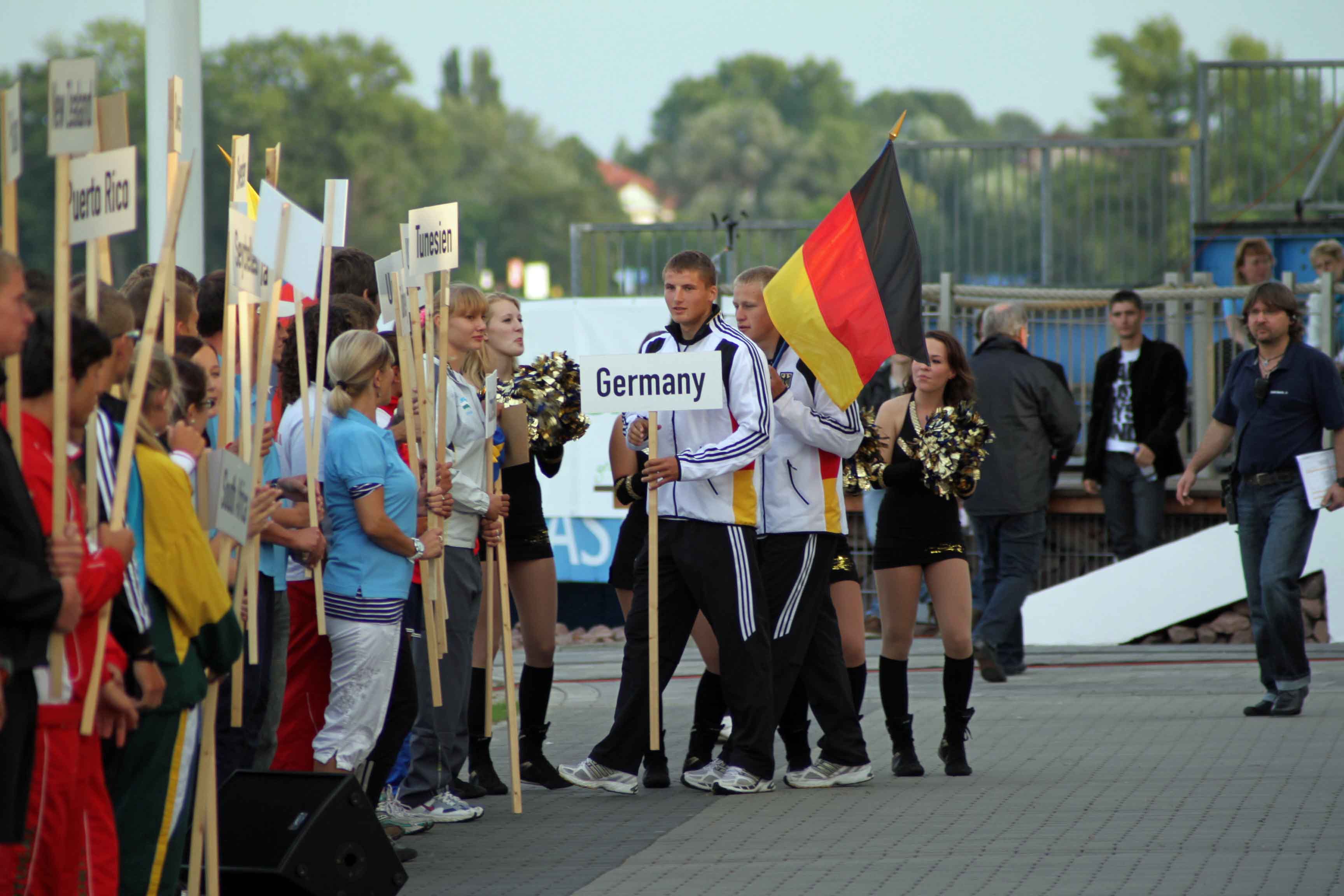 Mit einem Fahneneinmarsch der 64 teilnehmenden Nationen begann die große Eröffnungsfeier. Begleitet von lautstarkem Beifall marschierte Gastgeber Deutschland als letzte Nation ein.