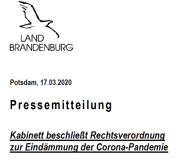 Die Verordnung des Landes Brandenburg über Maßnahmen zur Eindämmung des neuartigen Coronavirus SARS-CoV-2 und COVID-19 in Brandenburg wurde im Gesetz- und Verordnungsblatt für das Land Brandenburg GVBI. II – 2020, Nummer 10 veröffentlicht, die hier genannten Informationen bereits vorab in der Pressemitteilung der Staatskanzlei bekannt gegegen.