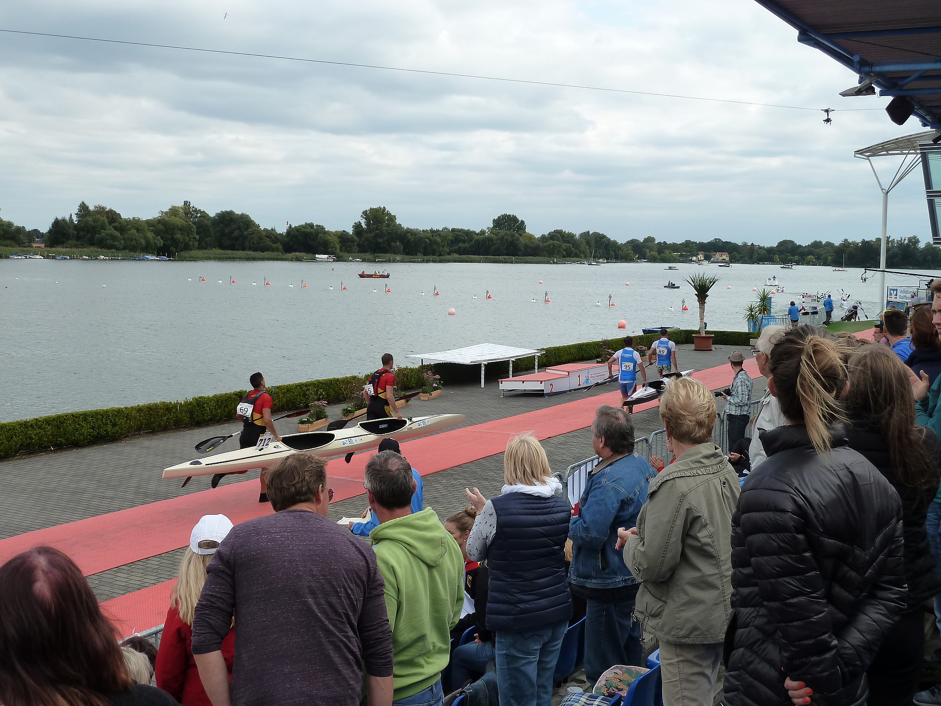 Besonders lautstark wurde es an allen drei WM-Tagen auf der gut besetzten Zuschauertribüne immer dann, wenn die Aktiven zum Abschluss einer Runde zur sogenannten Portage kamen. Beim Aussteigen aus dem Wasser, dem Tragen der Boote über die ca. 200 Meter lange und im Laufschritt zu absolvierende Strecke und beim Wiedereinstieg kam es zu vielen spannenden Positionskämpfen, aber auch zu einigen kleinen Missgeschicken. Die davon betroffenen Sportlerinnen und Sportler, die manchmal weit abgeschlagen dem Starterfeld hinterher fuhren, freuten sich ganz besonders über den stürmischen Applaus und die Anfeuerungsrufe des weltoffenen und fairen Brandenburger Publikums.
