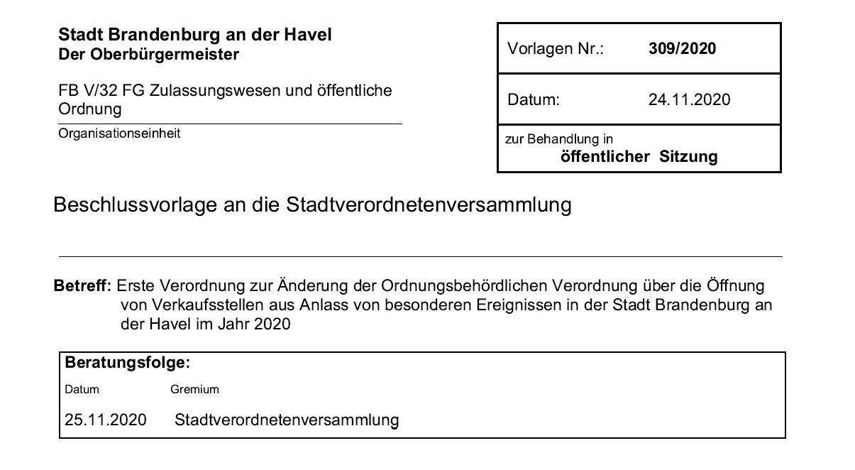 Aufgrund des Fachaufsichtsschreibens des Ministeriums für Soziales, Gesundheit, Integration und Verbraucherschutz des Landes Brandenburg vom 19. November 2020 hat die Stadtverordnetenversammlung am 25.11.2020 mit der Vorlage Nummer 309/2020 beschlossen, dass der verkaufsoffene Sonntag am 29.11.2020 (1. Advent) entfällt.