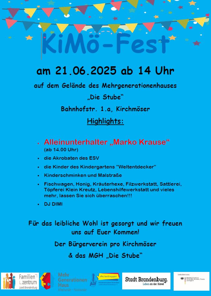 Samstag, 21. Juni 2025 findet ab 14 Uhr auf dem Gelände des Mehrgenerationenhauses „Die Stube“ in Kirchmöser (Bahnhofstraße 1a) das traditionelle KiMö-Fest statt. Veranstalter sind der Bürgerverein „Pro Kirchmöser“ und das MGH „Die Stube“.