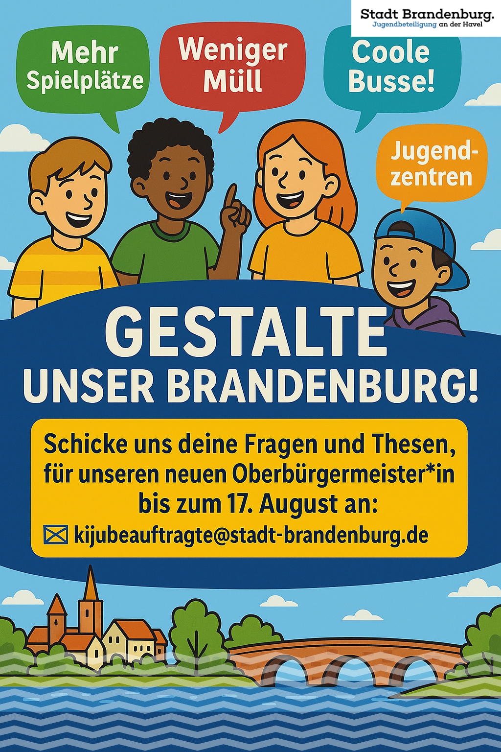 Dazu ruft sie alle Kinder und Jugendlichen der Stadt Brandenburg an der Havel auf, bis zum 17. August 2025 Thesen in den teilnehmenden Jugendhäusern abzugeben oder per E-Mail kijubeauftragtestadt-brandenburg.de zu senden, die Kandidatinnen und Kandidaten zugesandt werden. Dabei sollte es um Fragen gehen, die konkret die Stadt Brandenburg betreffen und dessen Themen von einem Oberbürgermeister beeinflusst werden können.