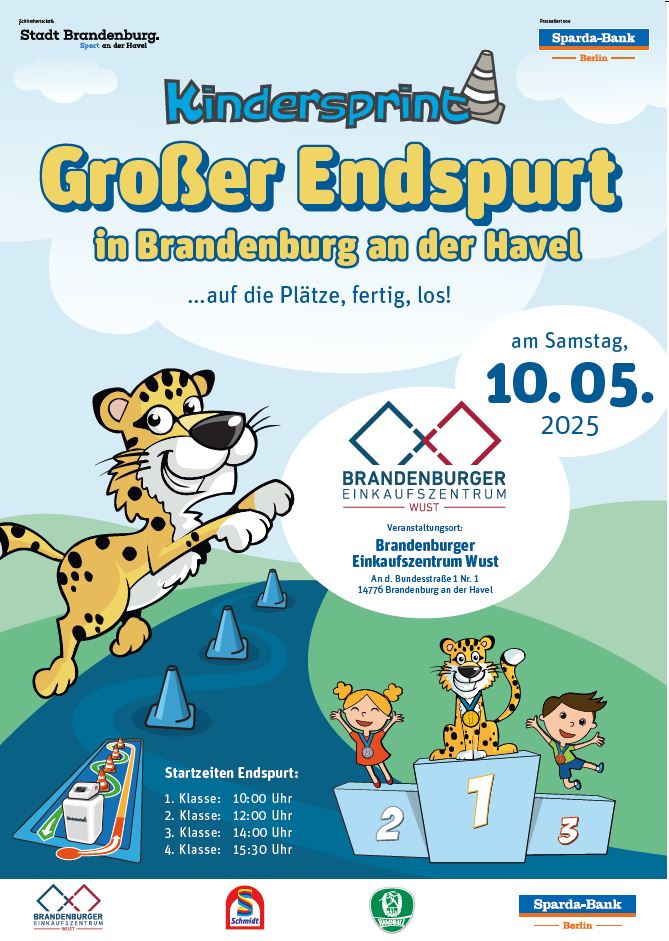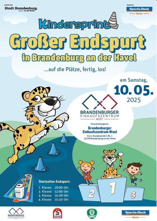 Der große Endspurt des Kindersprint-Wettbewerbs durch den Parcours findet am Samstag, 10. Mai, im Brandenburger Einkaufszentrum Wust statt. Die Vorrunden werden in den lokalen Grundschulen vom 29. April bis 9. Mai 2025 stattfinden, wobei sich die schnellsten Grundschulkinder für das Finale qualifizieren können.