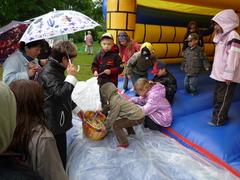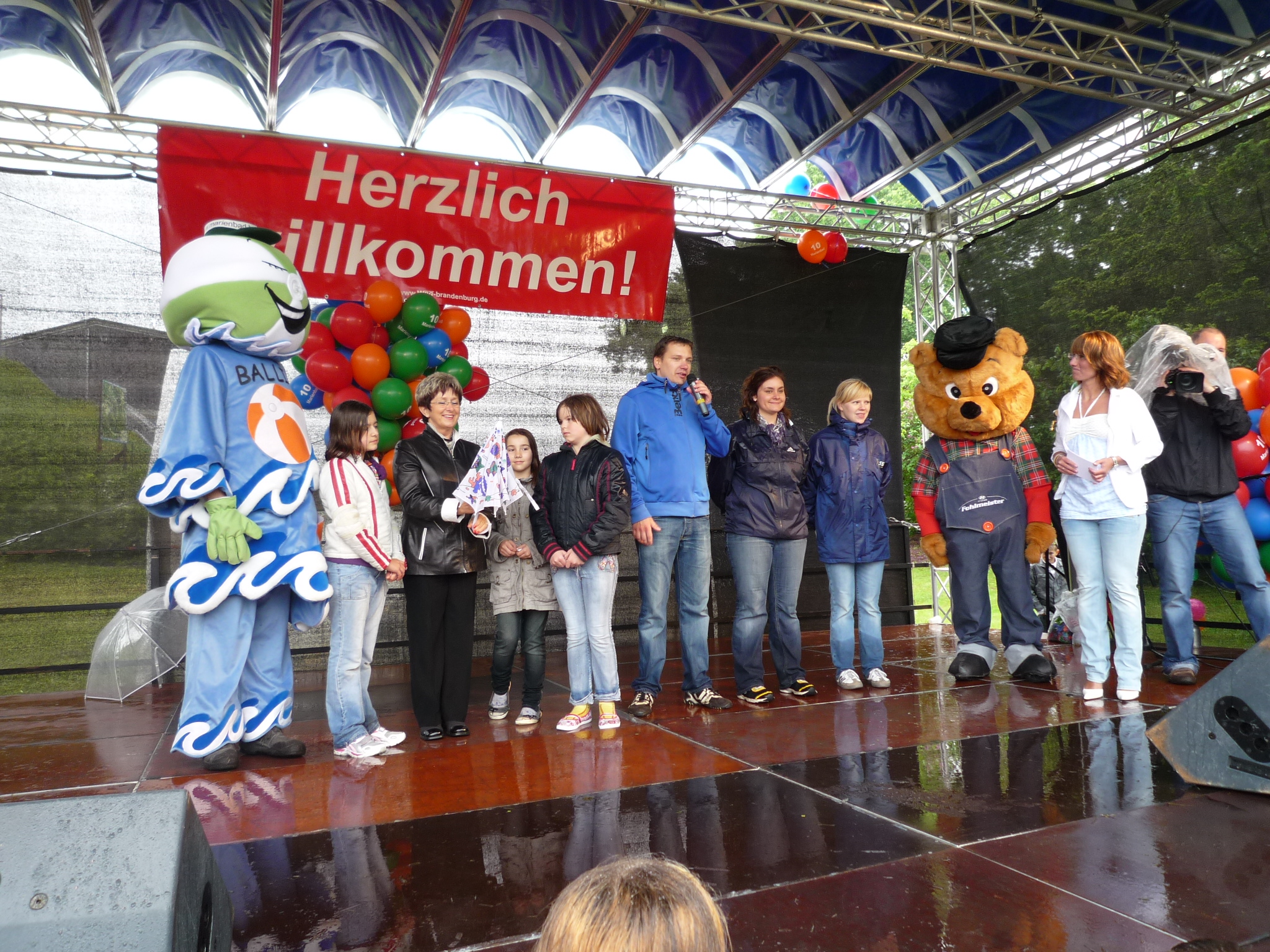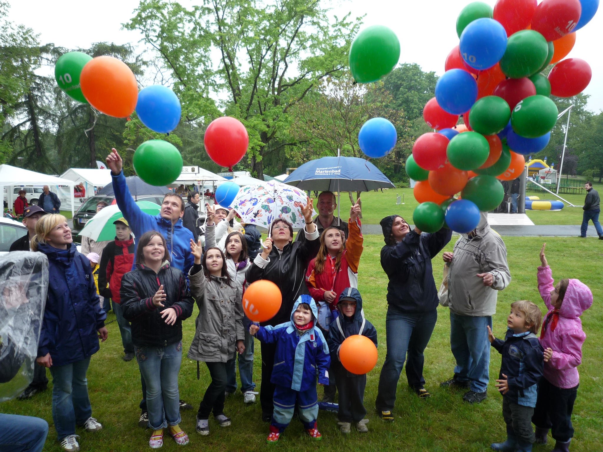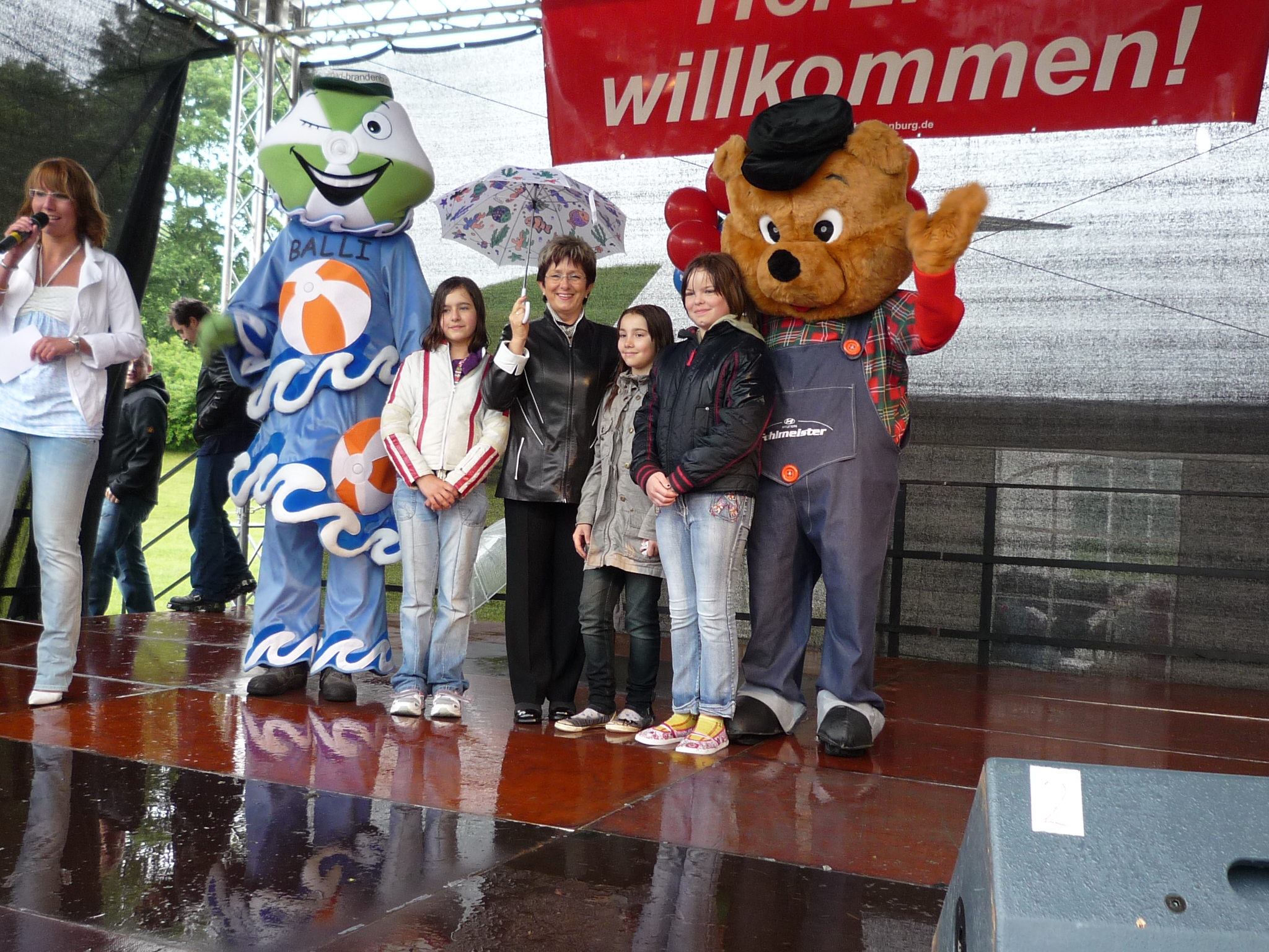 Oberbürgermeisterin Dr. Dietlind Tiemann eröffnete heute um 11:00 Uhr das Kindertagsfest auf dem Marienberg. „Der Kindertag muss nicht immer mit Geschenken verbunden sein, viel wichtiger ist es, dass man etwas gemeinsam in Familie unternimmt“ antwortete sie auf die Frage der Moderatorin Janine Matzdorf, was für die Oberbürgermeisterin Kindertag bedeute. Sie dankte allen Helfern, Organisatoren und Mitwirkenden, die trotz des nassen Wetters den Veranstalter Daniel Güttler unterstützen. Gemeinsam mit der Kinder- und Jugendbeauftragten der Stadt Brandenburg an der Havel Susanne Assmann hatte er das Fest organisiert. Die Oberbürgermeisterin bekam von drei Mädchen symbolisch einen kleinen bemalten Regenschirm, den sie heute gut gebrauchen konnte, für die Schirmherrschaft übergeben. Nachdem die Luftballons in den Himmeln aufgestiegen waren und das Fest somit eröffnet war, ging sie mit ihren 3 kleinen Helferinnen und den mitgebrachten Süßigkeiten von Stand zu Stand. Jeder, ob groß oder klein, durfte in den Korb greifen und sich etwas Süßes nehmen.