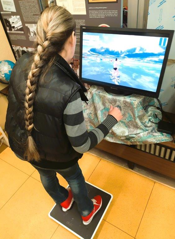 Die Seniorinnen und Senioren stellen sich auf eine Kraftmessplatte. Durch Verlagerung ihres Körpergewichts steuern sie die Spiele und trainieren so ihre Beweglichkeit. Auch wer bereits auf einen Rollator angewiesen ist, kann die Spielstation bedienen.