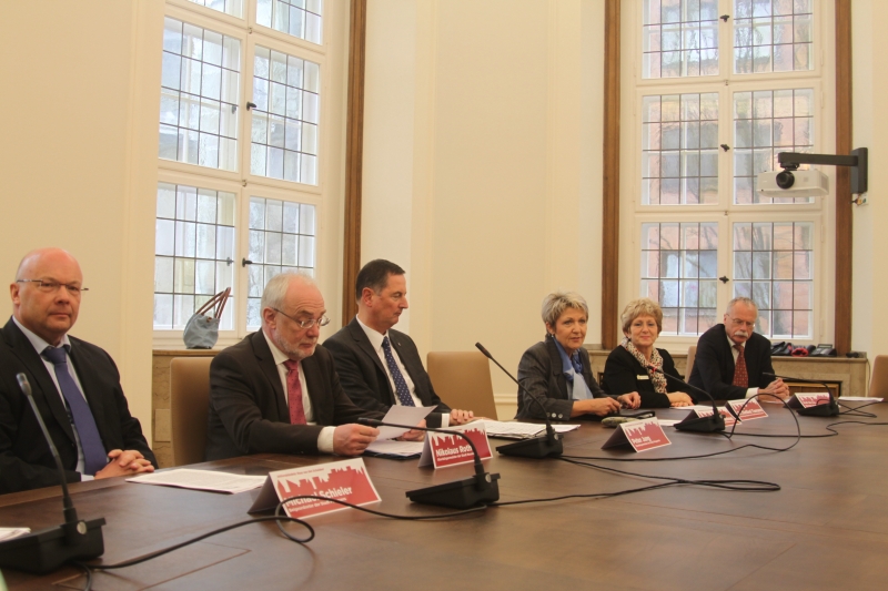 Auf Einladung von Mülheims Oberbürgermeisterin Dagmar Mühlenfeld und Wuppertals Oberbürgermeister Peter Jung, Sprecher des Aktionsbündnisses „Raus aus den Schulden“, trafen sich am Freitag, 21.03.2014, im Rathaus von Mülheim an der Ruhr fast 40 Oberbürgermeisterinnen, Oberbürgermeister, Landräte und Kämmerer zu einer Kommunalkonferenz.