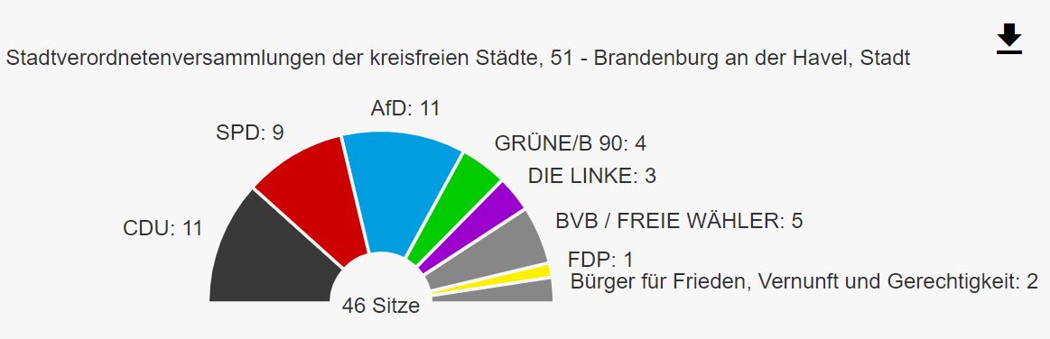 Demnach verteilen sich die 46 Sitze der Stadtverordnetenversammlung mit jeweils 11 auf CDU und AFD, 9 für die SPD, 5 für BVB/Freie Wähler, 4 für Grüne/B90, 3 für Die Linke, 2 für Bürger für Frieden, Vernunft und Gerechtigkeit, 1 für die FDP.