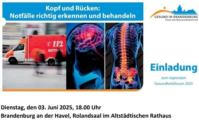 Der Verein Gesund in Brandenburg e.V. lädt alle interessierten Bürgerinnen und Bürger am Dienstag, dem 3. Juni 2025 um 18:00 Uhr, zum Gesundheitsforum im Rolandsaal des Altstädtischen Rathauses ein. Diesmal geht es um das Thema "Kopf und Rücken: Notfälle richtig erkennen und behandeln.