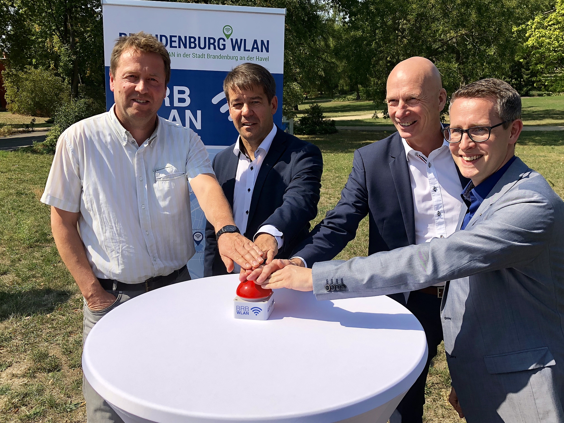 Ein kostenfreier Internetzugang steht ab sofort allen Bürgerinnen und Bürgern, Touristen und Gästen der Stadt Brandenburg an zentralen öffentlichen Plätzen zur Verfügung. Den Startschuss für das öffentliche WLAN-Netz „BRB WLAN" gab heute Oberbürgermeister Steffen Scheller gemeinsam mit Gunter Haase und Uwe Müller, Geschäftsführer der StWB Stadtwerke Brandenburg an der Havel GmbH & Co. KG, sowie Stefan Tiemann, Geschäftsführer der RFT kabel Brandenburg GmbH.