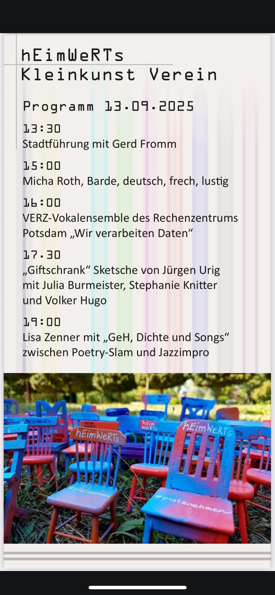 - 13.09.2025: Programm vom hEimWeRTs-Kleinkunstverein (siehe Flyer),
