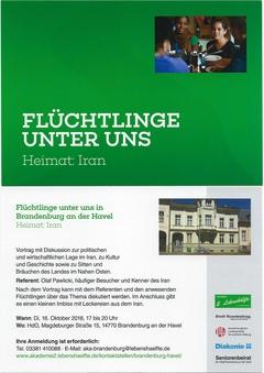 Am Dienstag, dem 16.10.2018, lädt das Flüchtlingsnetzwerk Brandenburg alle Bürgerinnen und Bürger zum Länderinformationsabend von 17 bis 20 Uhr über die kulturellen, politischen, religiösen und witschaftlichen Hintergründe des Landes Iran ein.