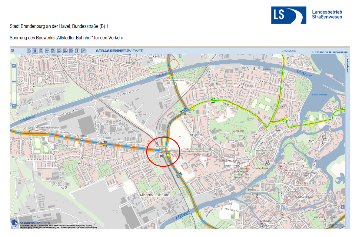 „Die Brücke über den “Altstädter Bahnhof" im Zuge der Magdeburger Landstraße (B 1) in Brandenburg an der Havel wird ab heute Abend (18.00 Uhr) für den Verkehr gesperrt. Diese Entscheidung wurde nach einer routinemäßigen Überprüfung des Bauwerks durch Prüfingenieure des Landesbetriebs Straßenwesen getroffen. Dabei wurden erhebliche Schäden festgestellt, die eine vorsorgliche Sperrung notwendig machen.