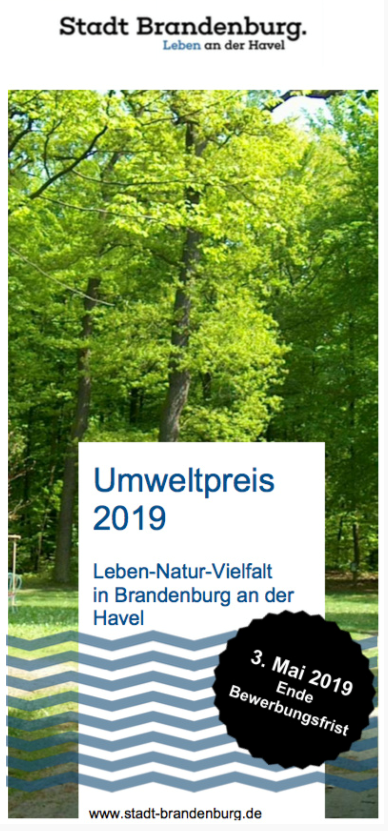 Anlässlich des Weltumwelttages, der am 25. Mai 2019 im Rahmen des Krugparkfestes gefeiert wird, können unter dem Motto „Leben-Natur-Vielfalt in Brandenburg an der Havel“ bis zum 3. Mai 2019 Projekte, die in geeigneter Weise zur Verbesserung der Artenvielfalt, des Klimas oder der Umwelt in der Stadt Brandenburg an der Havel beitragen, eingereicht werden. Die Projekte müssen noch nicht abgeschlossen sein. Es muss aber erkennbar sein, dass das angestrebte Ziel erreicht werden kann. Die Bewerbungsunterlagen sollen Ziel und Weg der durchgeführten bzw. geplanten Maßnahme aufzeigen.