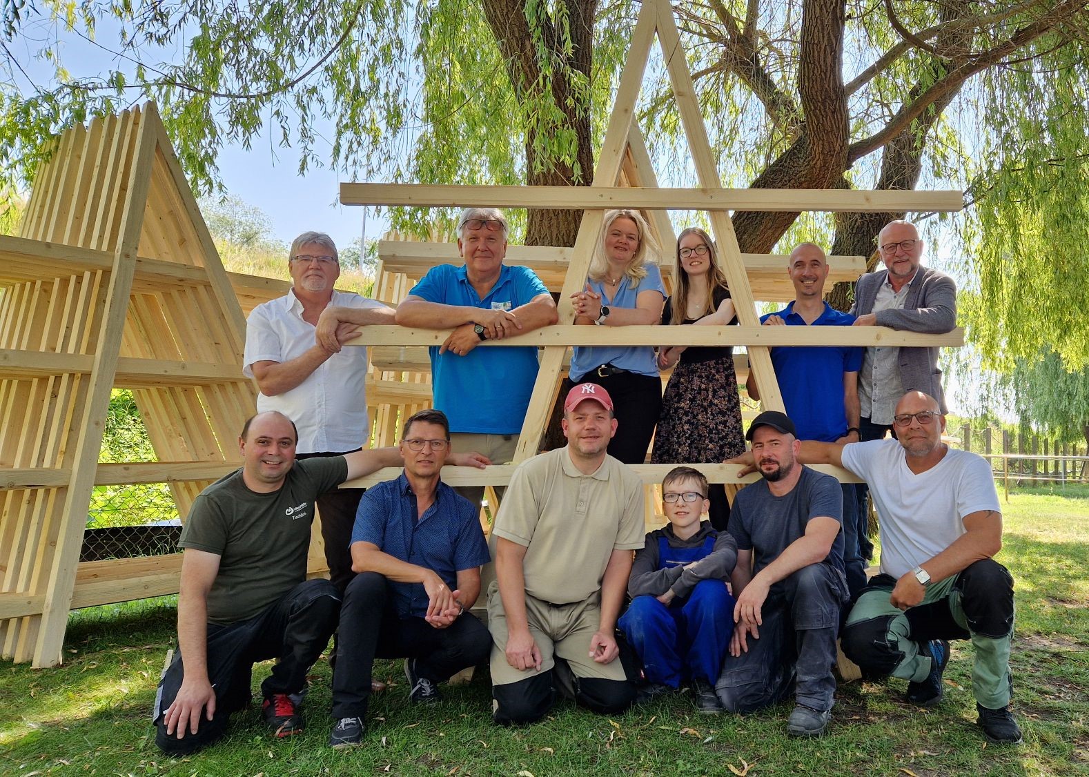 „Um Menschen mit Behinderungen dabei einbinden zu können, hat unser Tischlermeister eine große Schablone gebaut, in die die Holzleisten zum Verschrauben einfach eingelegt werden können. Die Hälfte haben wir bereits geschafft und haben für den Rest noch zwei Wochen Zeit,“